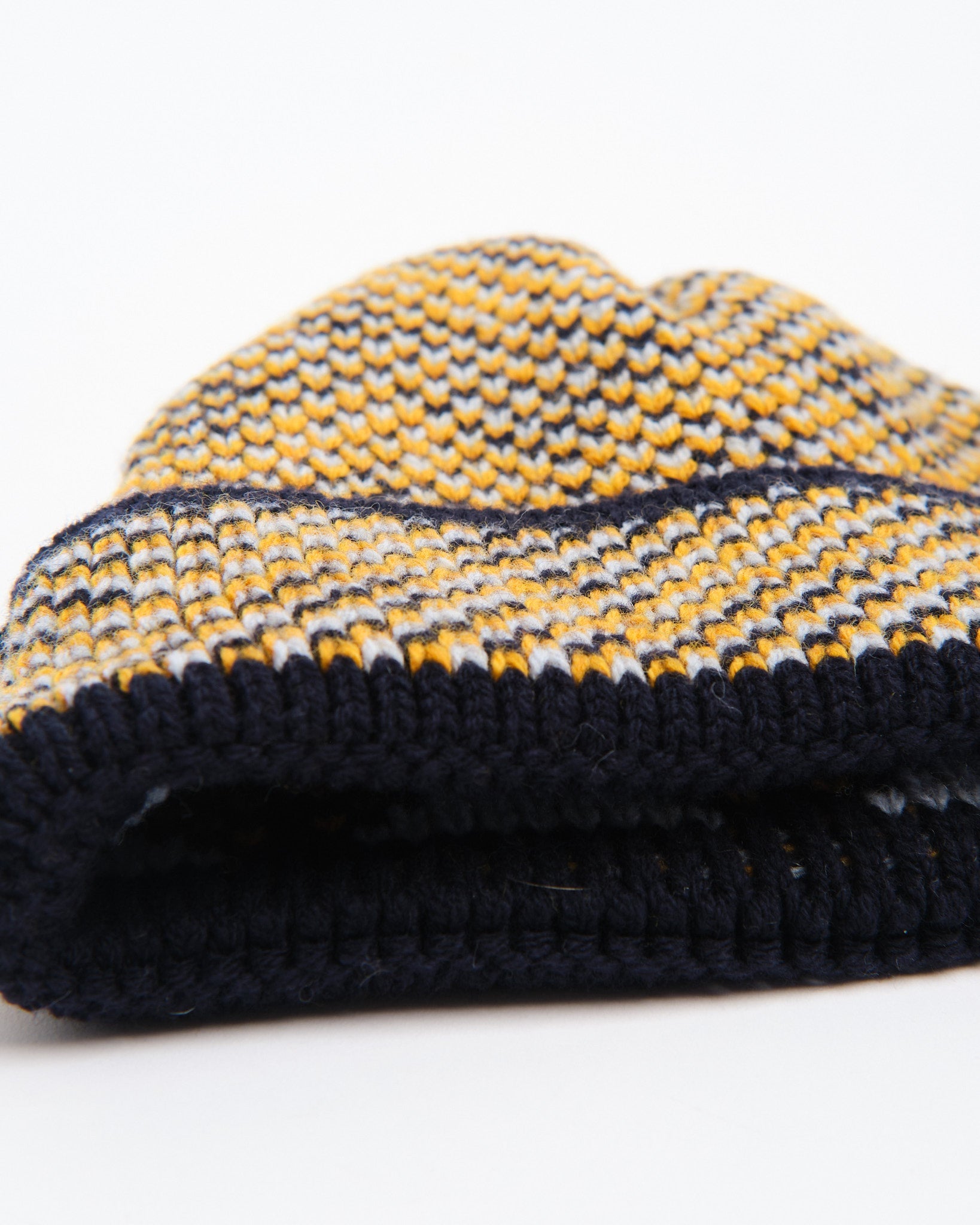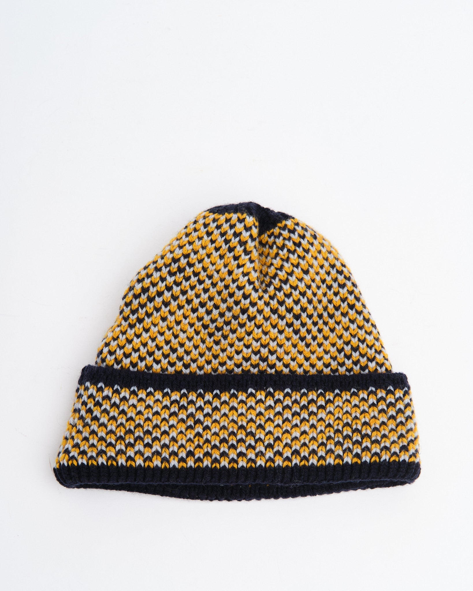 The Reverse Geo Beanie in Navy by Found Feather brings graphic structure and elevated texture into one compact package. Made in Japan from washable Italian Donegal wool, it features a bold reverse jacquard knit pattern that adds dimension without excess bulk. A soft stretch yarn and one-panel construction offer a smooth, secure fit, while the regular 7 cm brim gives it a classic touch. Finished with a woven label and a QR-coded care tag, this beanie blends head-turning design with cold-weather comfort.