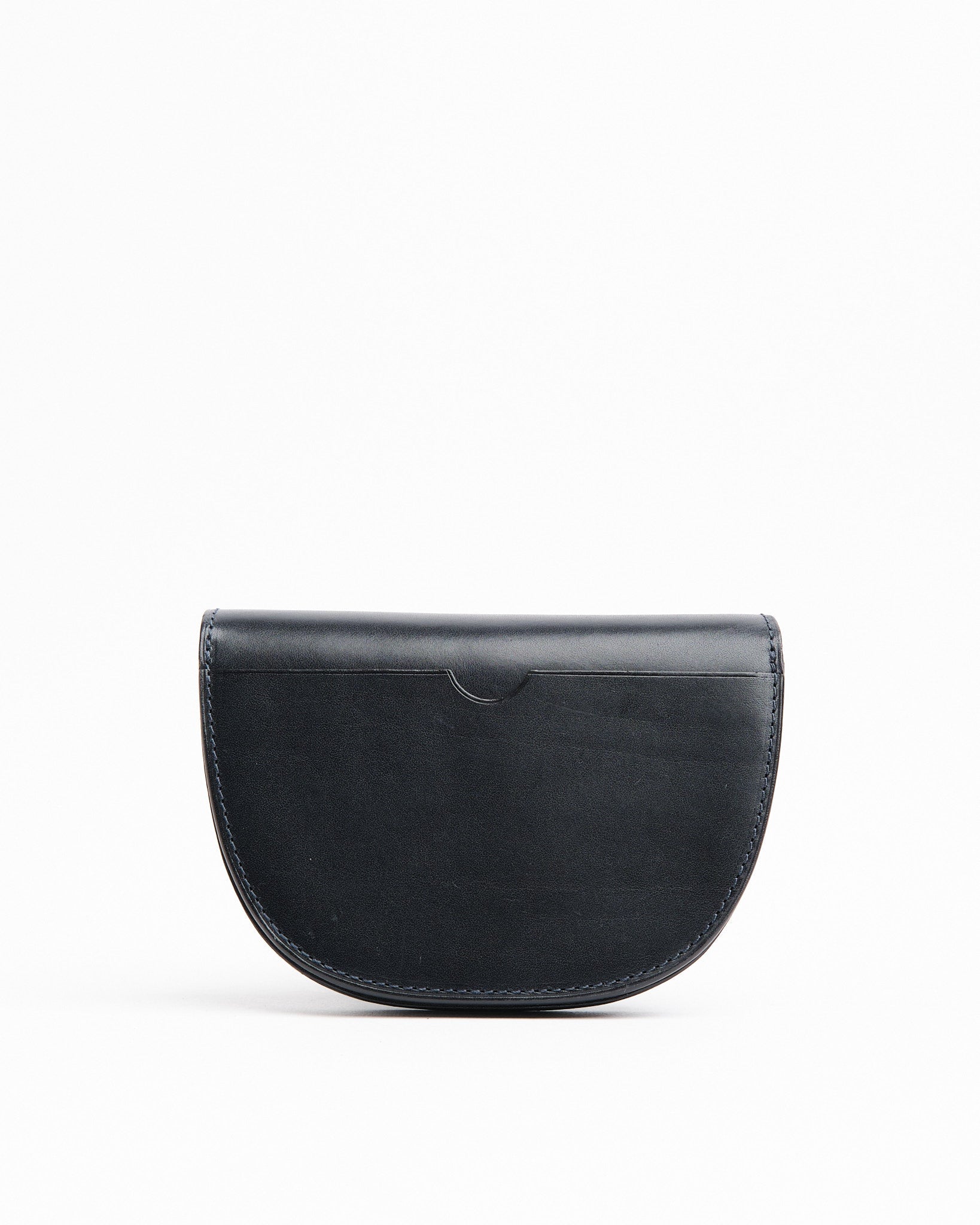 Kolla in Navy Kaptain Sunshine Round Wallet Mid Porch tillverkad av italienskt kohudsläder. Detta mångsidiga tillbehör fungerar både som plånbok och påse, med en klockformad ficka som erbjuder gott om förvaringsutrymme. Byt utseende genom att använda axelremmen för en blandning av praktisk användbarhet och sofistikation.