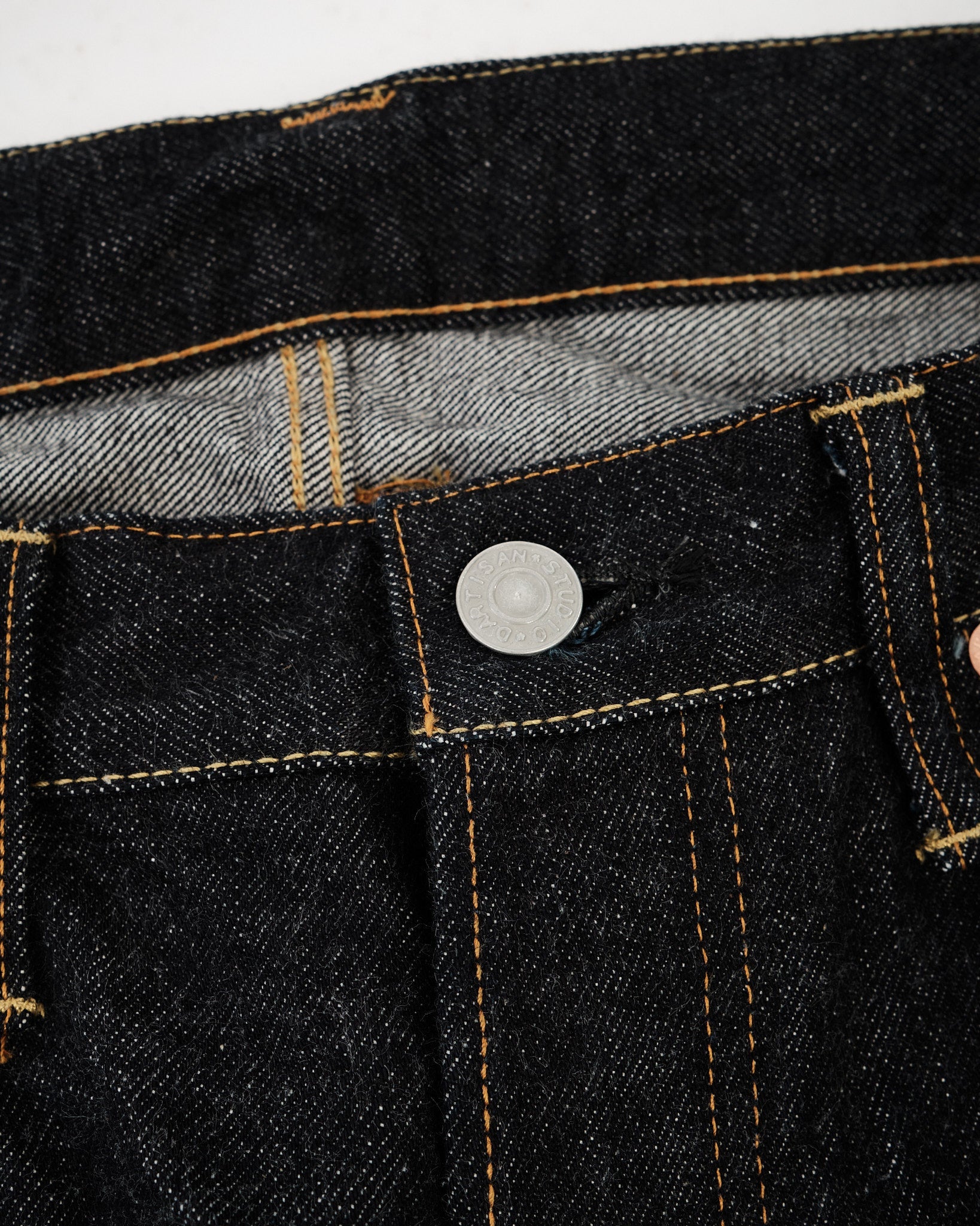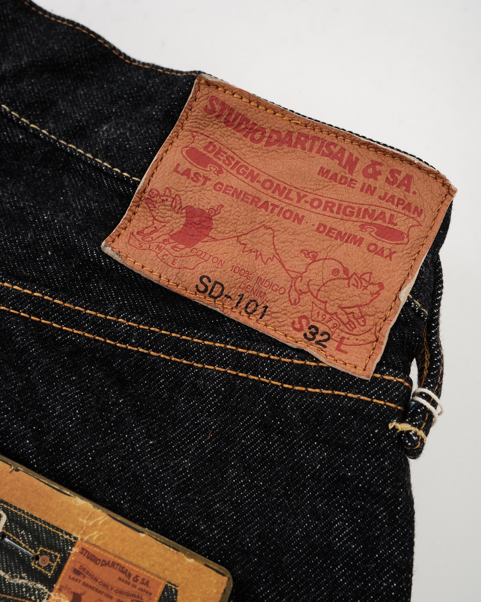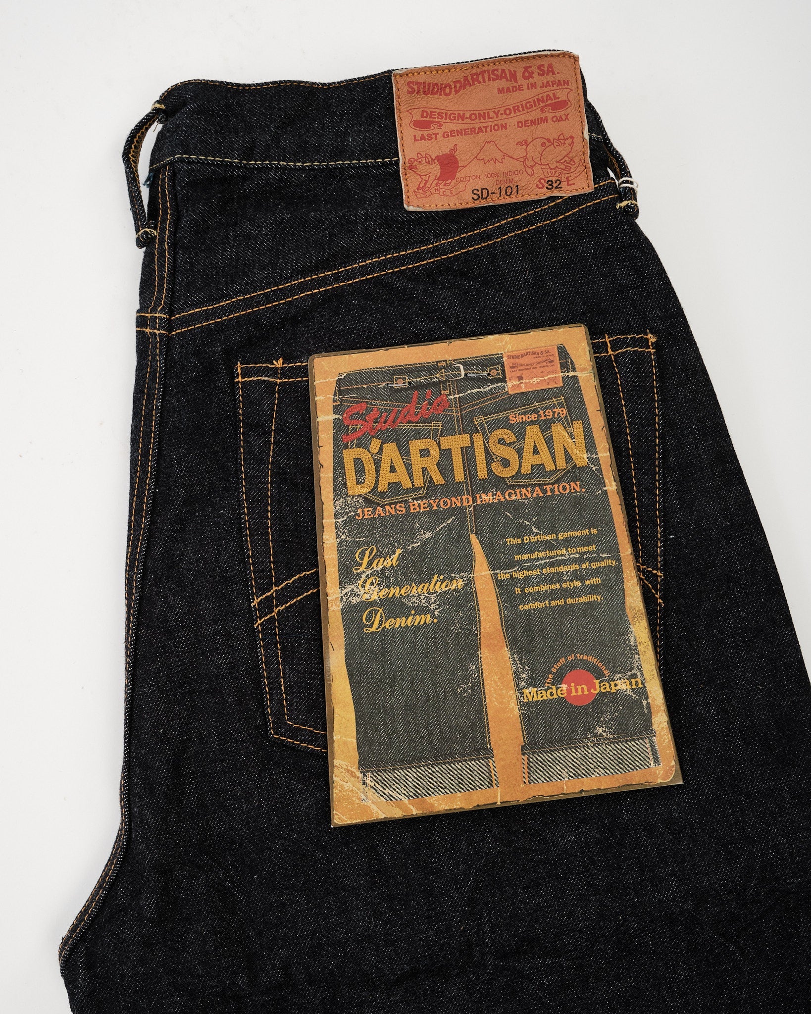 STUDIO D'ARTISAN SD-101 Regular Straight Jeans (SD-101) representerar märkets mest grundläggande raka modell och förkroppsligar traditionellt japanskt denimhantverk. Tillverkade av 15oz osanforiserad selvedge-denim, vävda på sällsynta skyttelvävstolar, har dessa jeans en fast struktur och djup indigofärg.
