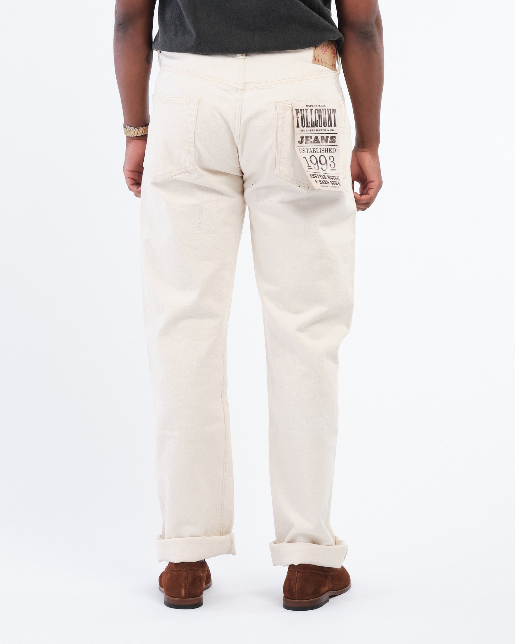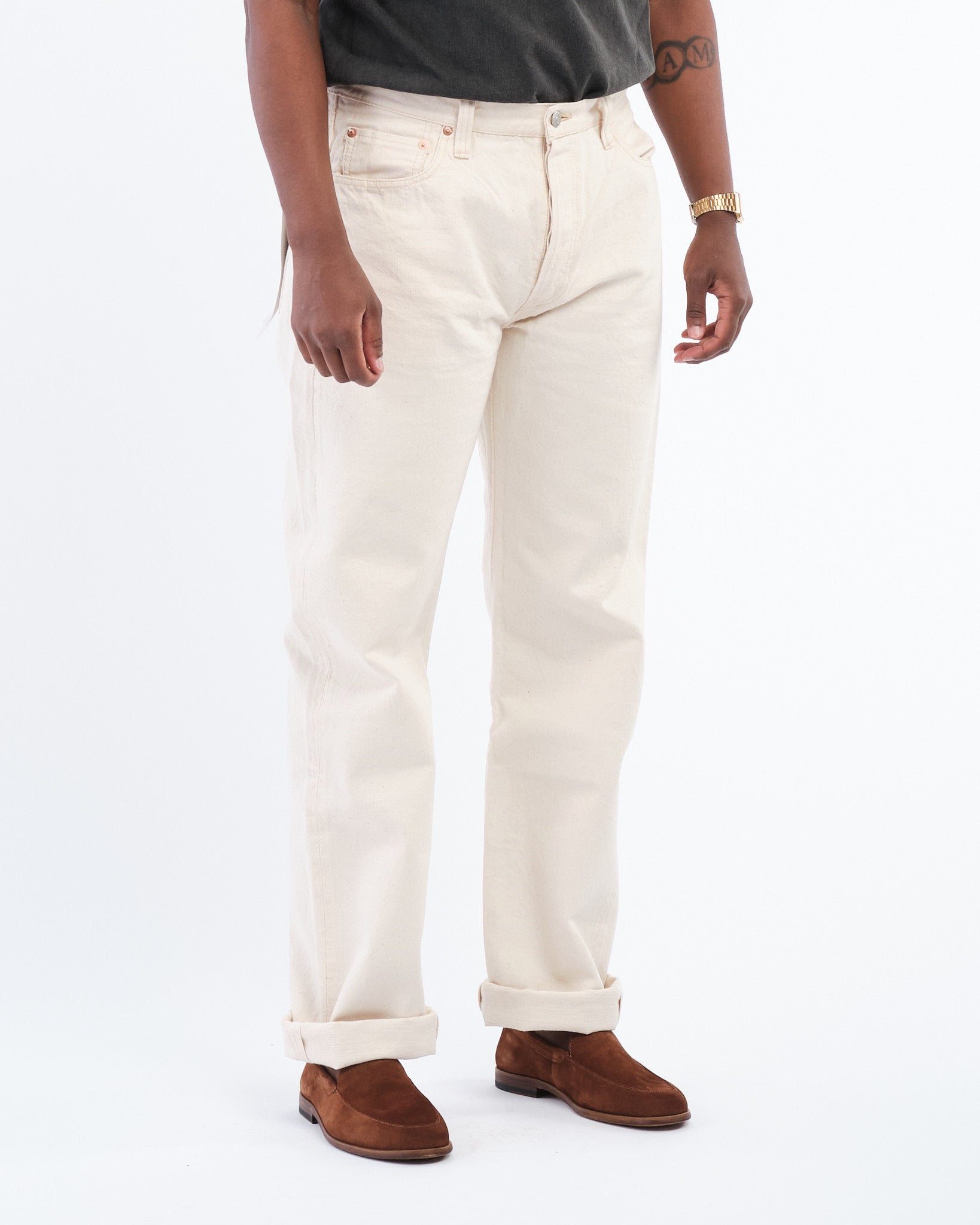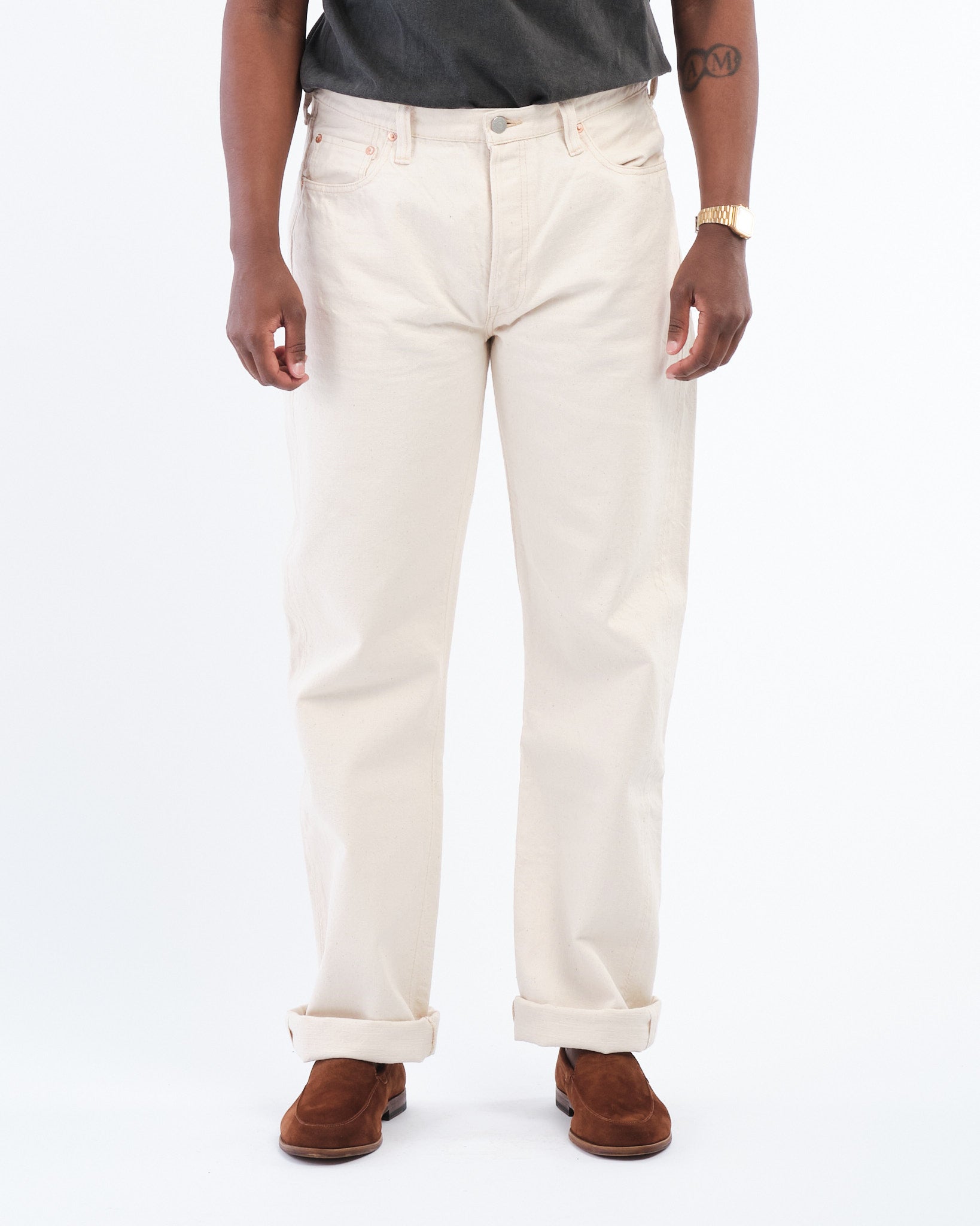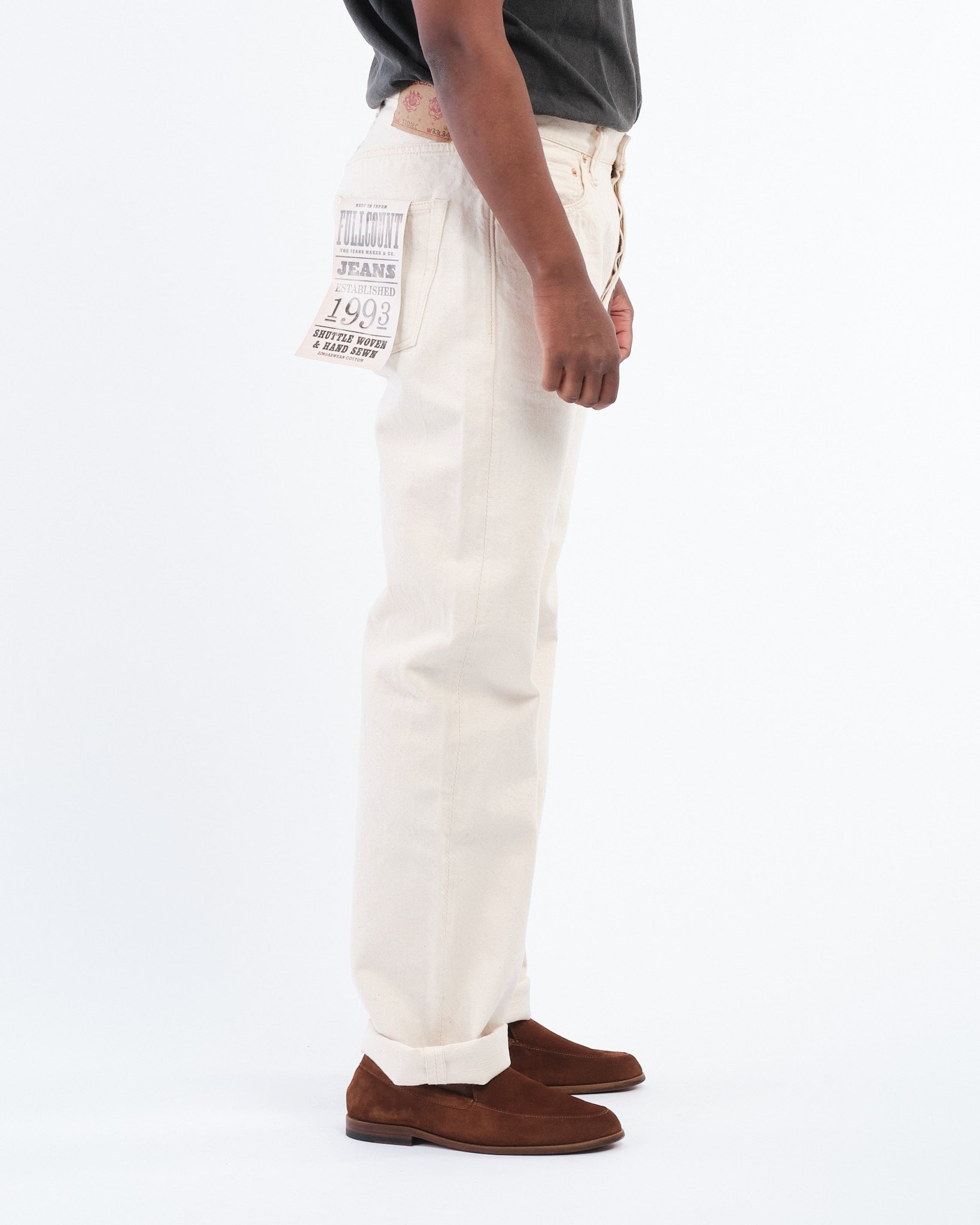 FULL COUNT 1101EC STRAIGHT ECRU SELVEDGE DENIM (1101EC) är tillverkade av 100 % ekologisk bomull och vävda i Japan för att bevara bomullsplantans naturliga egenskaper. Till skillnad från traditionell denim är detta 13,7oz selvedge-tyg varken färgat eller blekt, vilket innebär att bomullsrester som blad- och stjälkfragment finns kvar och ger en unik textur och ett autentiskt, naturligt utseende. Den klassiska 1101 Straight-Leg-siluetten ger en tidlös passform med hög slitstyrka och komfort. Tyget vävs på traditionella vävstolar, vilket ger det en naturlig elasticitet och hållbarhet. Med tiden faller bomullsresterna bort genom tvätt, vilket ytterligare framhäver tygets naturliga karaktär.