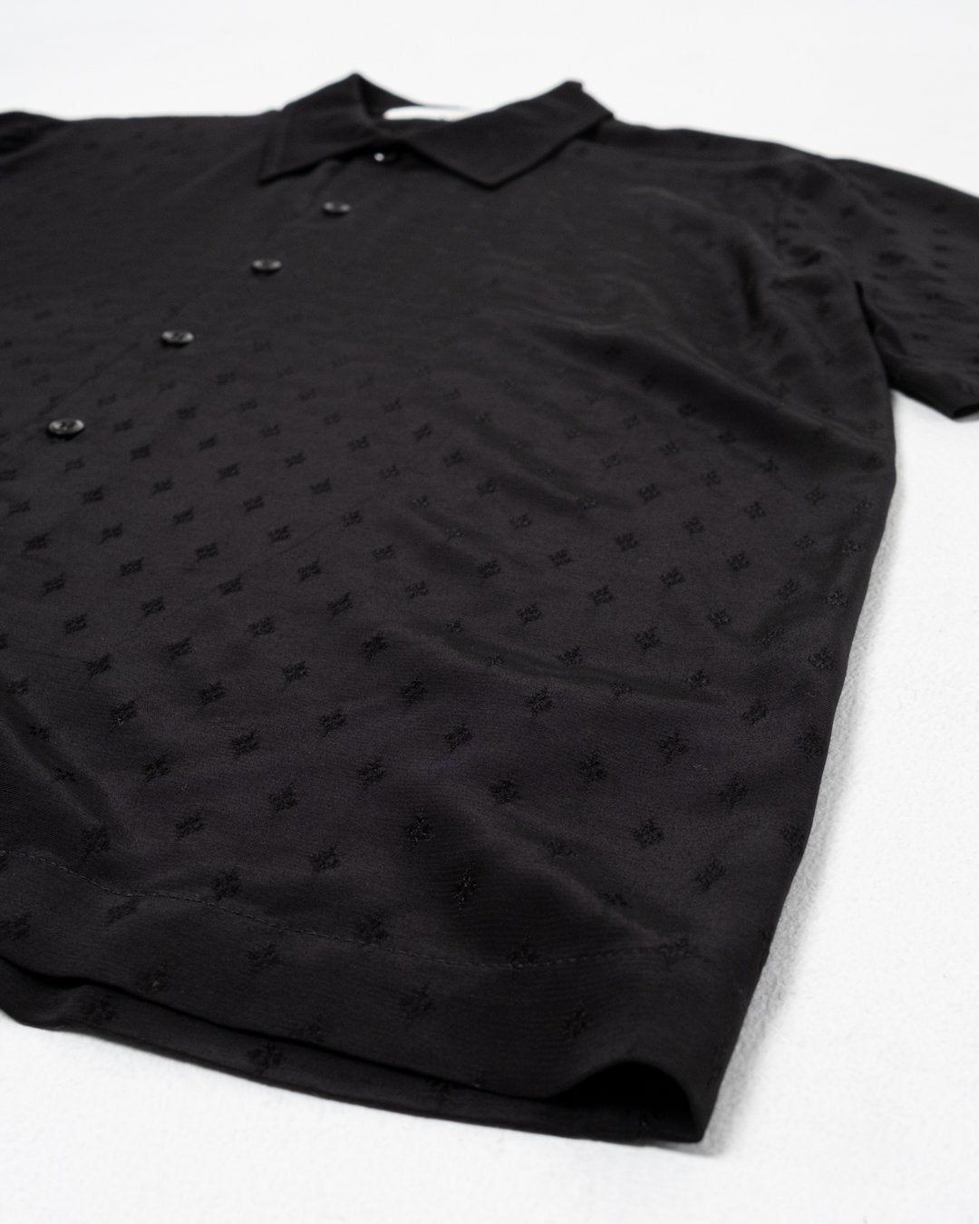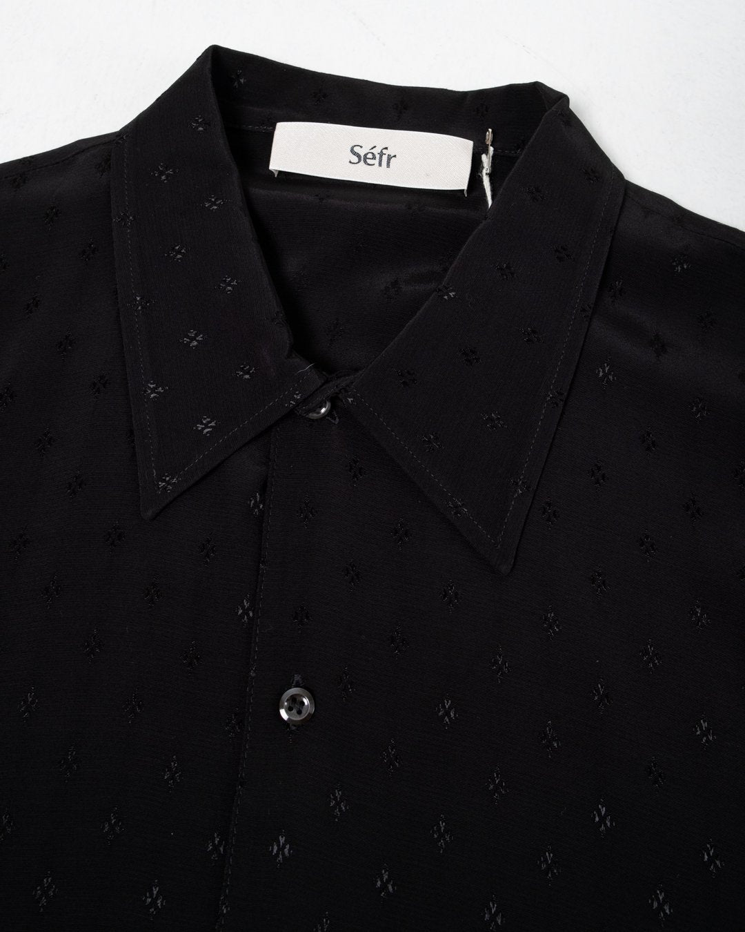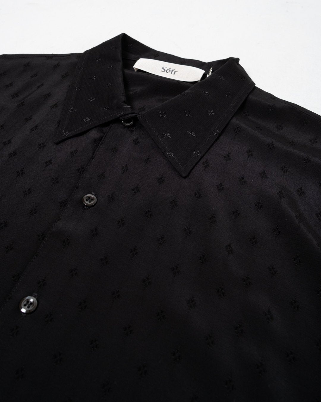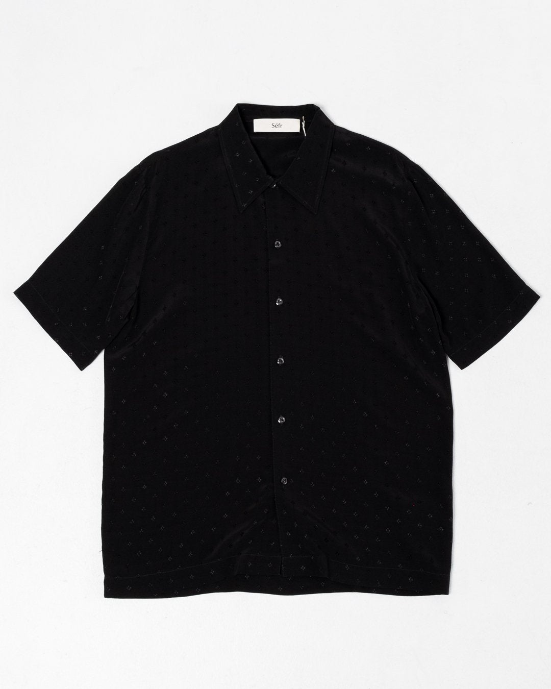 Suneham Skjorta Svart Tryck från Séfr. Kortärmad skit med avslappnad passform och bred krage. Pärlemorknappar från Italien, och tyget i 100% viskos. Tillverkad i Lettland.
