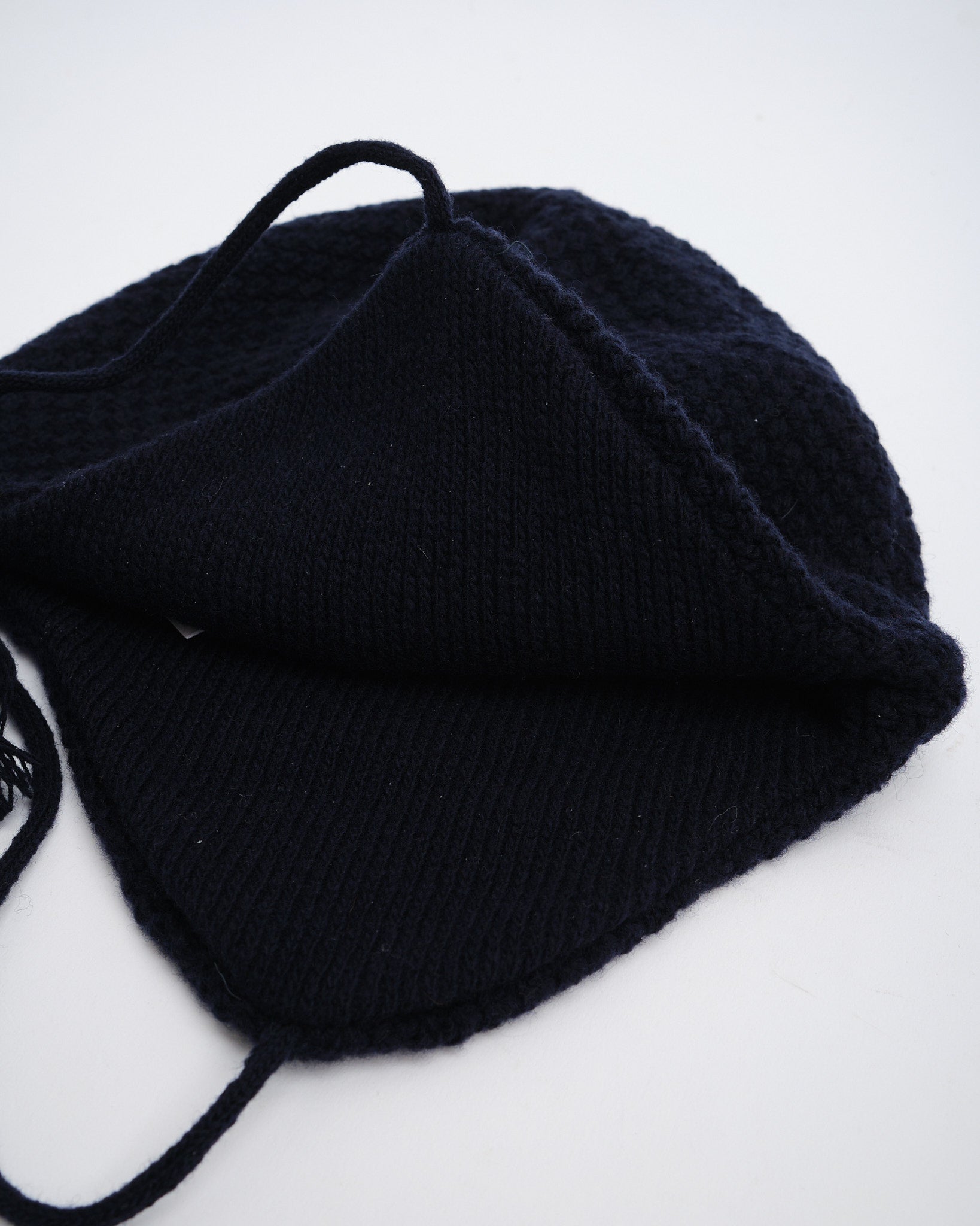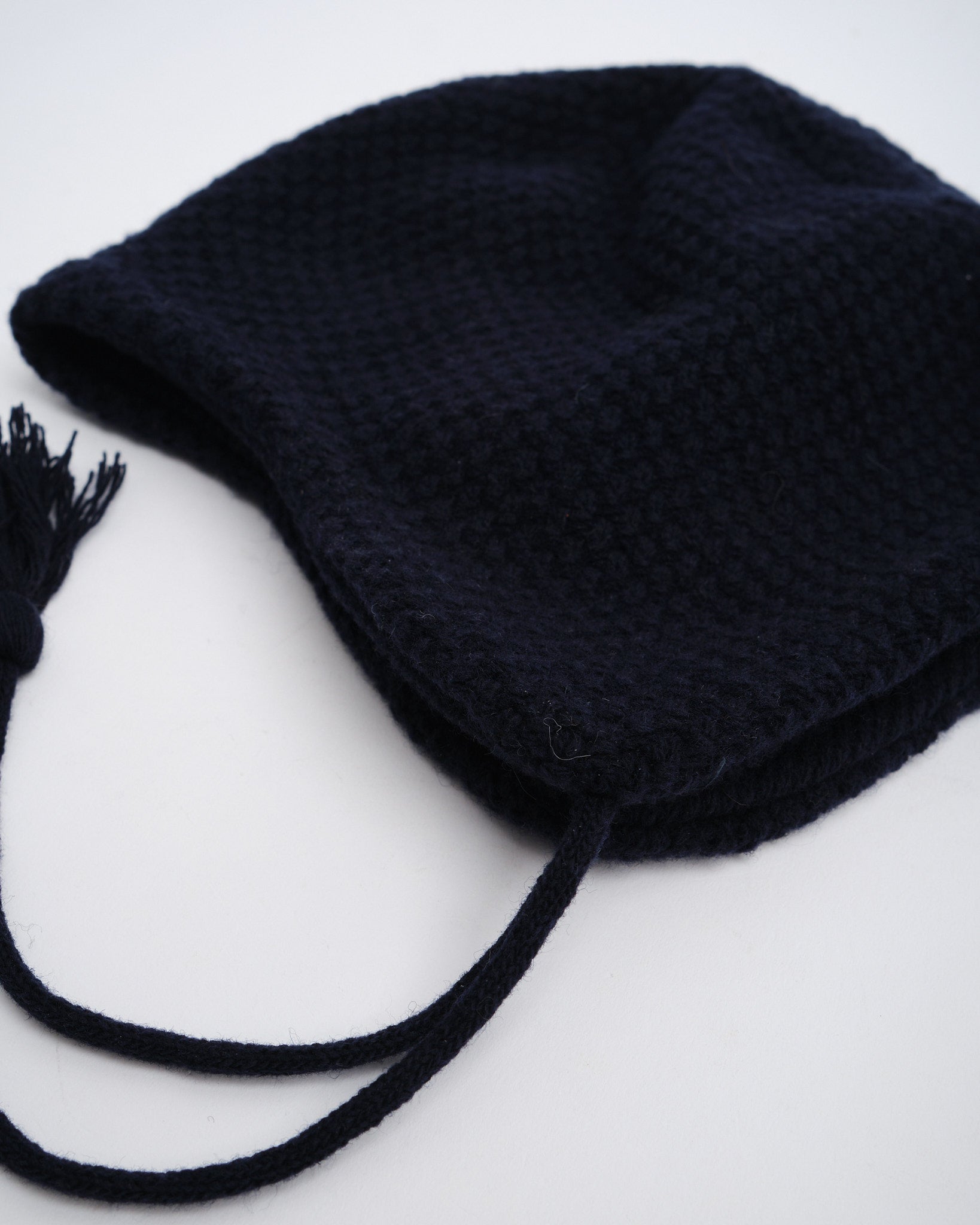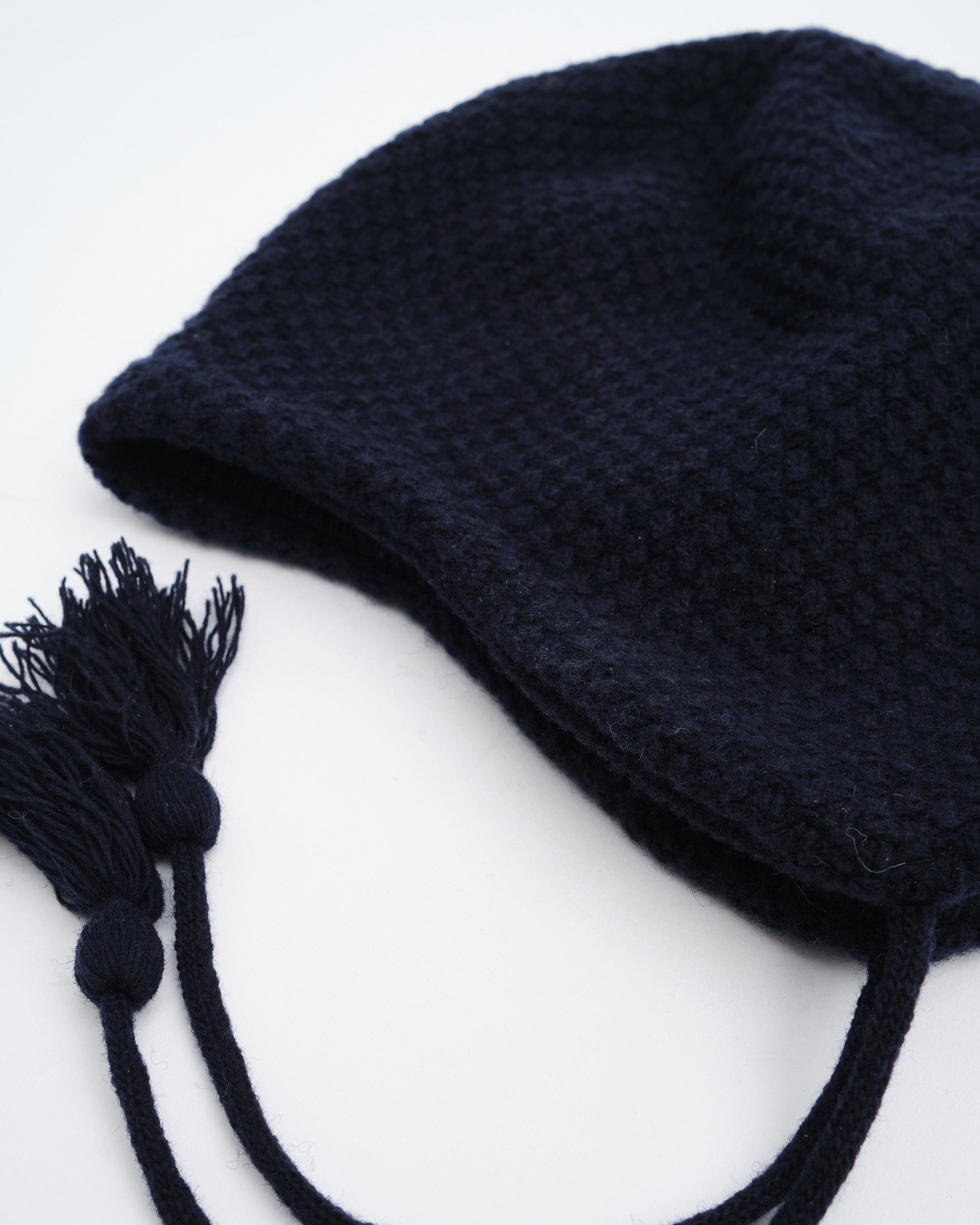 The Trek Beanie in Navy by Found Feather is made for crisp weather and everyday adventure. Crafted in Japan from a washable lambswool blend, it features a dobby cable knit pattern with a brushed interior for extra softness. The 8.5 cm ear panels and self-yarn lace and tassels add both charm and functionality, while the one-panel construction provides a clean silhouette. With its snug, unisex fit and QR-coded care tag, this beanie is ready for urban treks or countryside escapes.