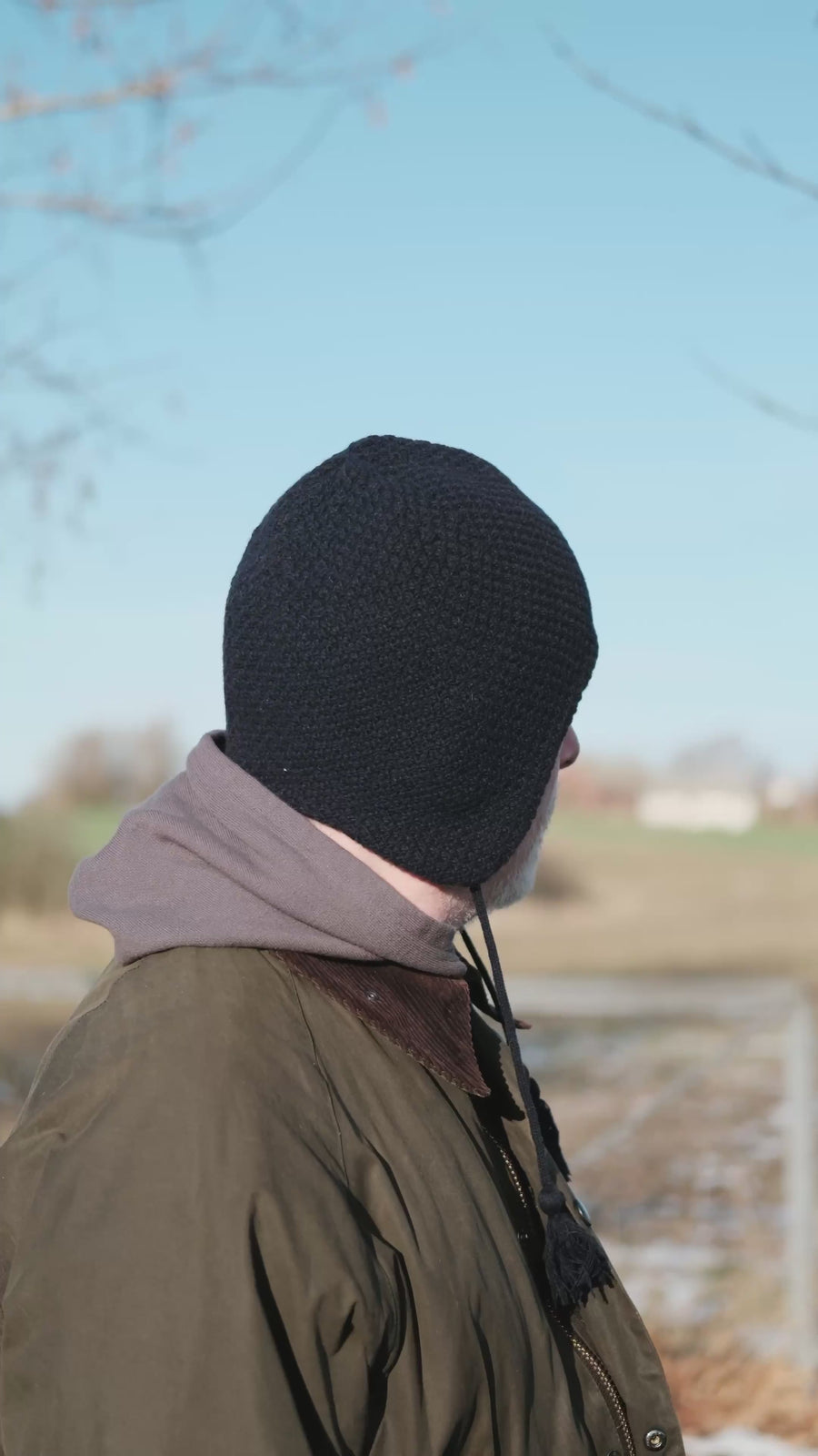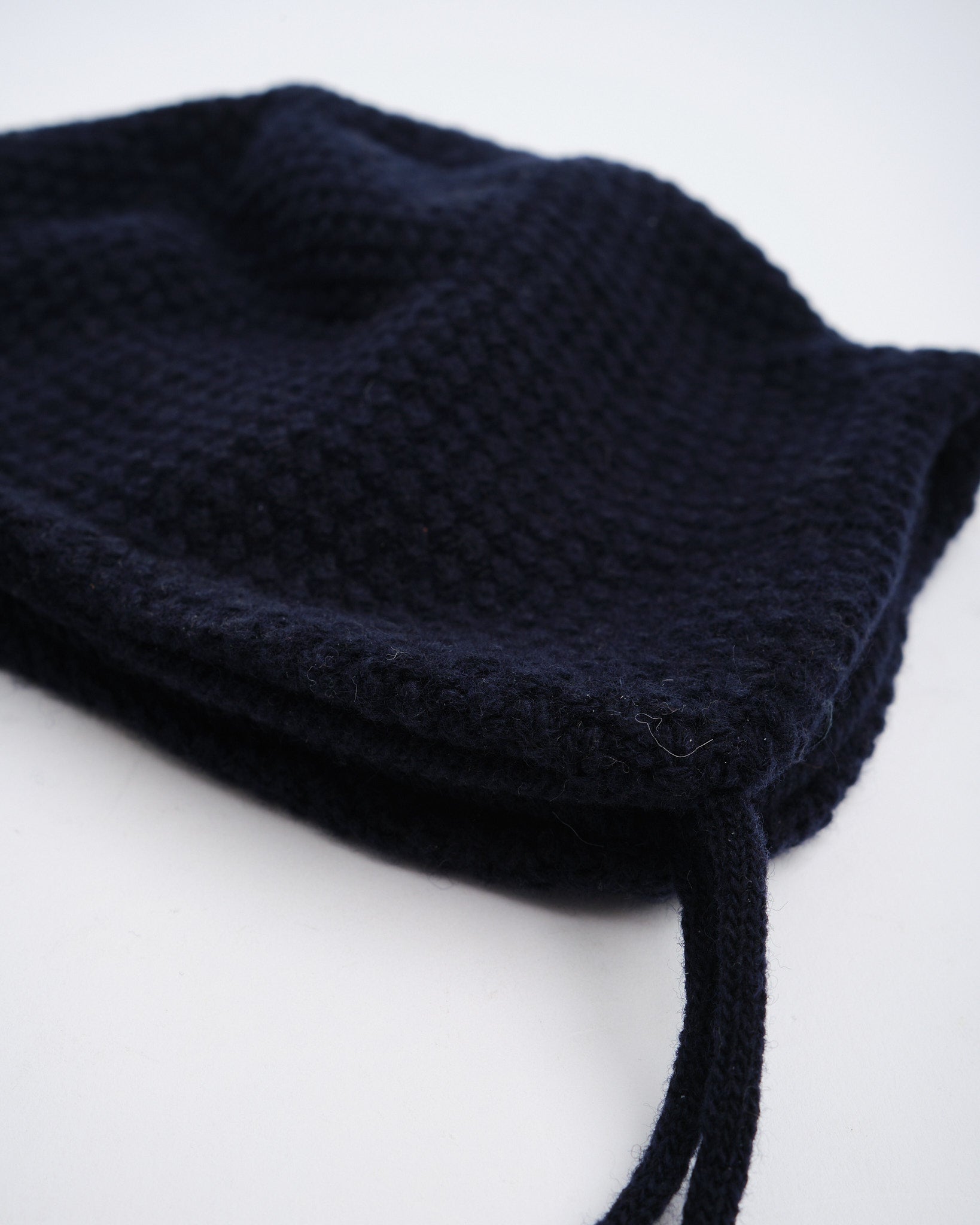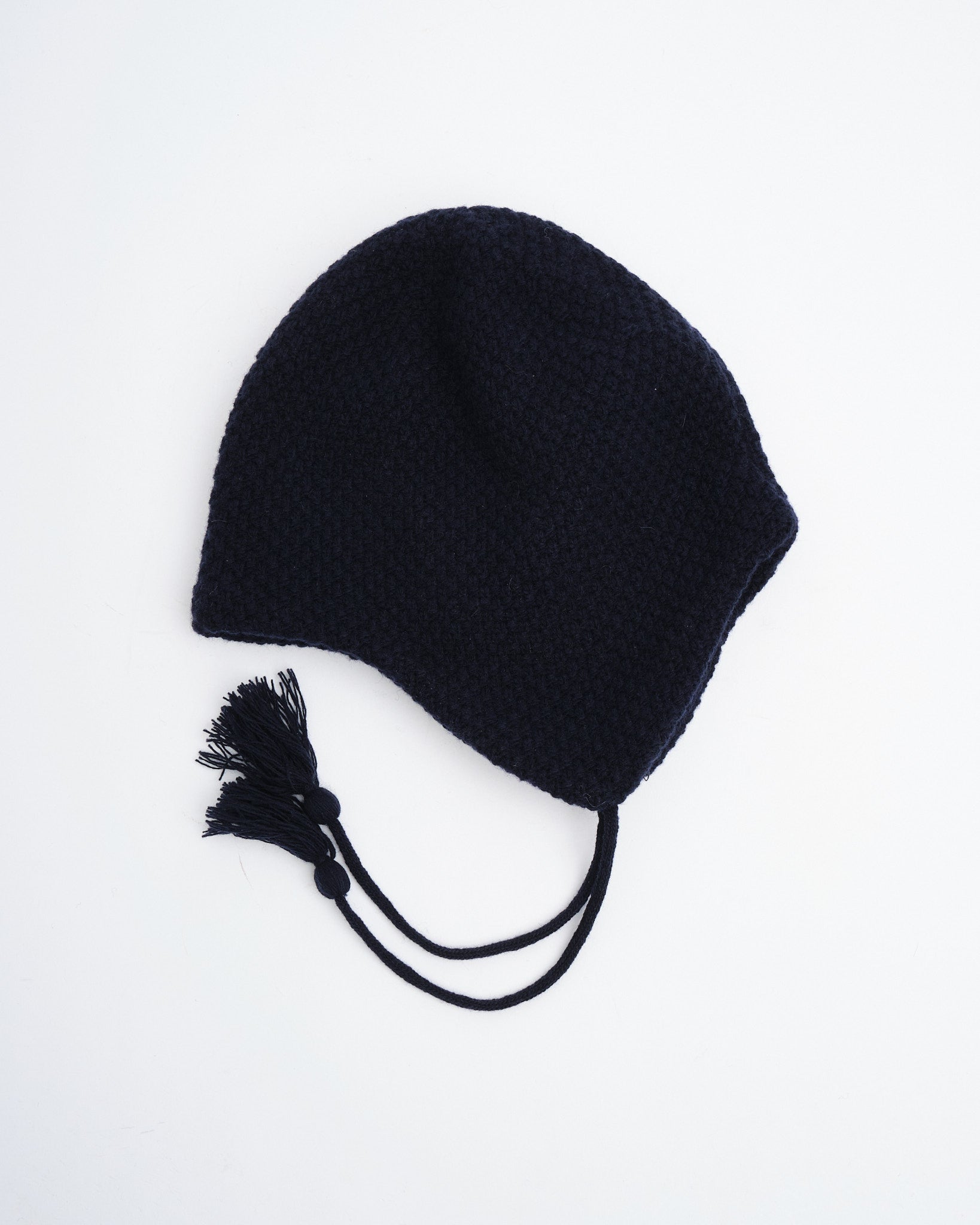 The Trek Beanie in Navy by Found Feather is made for crisp weather and everyday adventure. Crafted in Japan from a washable lambswool blend, it features a dobby cable knit pattern with a brushed interior for extra softness. The 8.5 cm ear panels and self-yarn lace and tassels add both charm and functionality, while the one-panel construction provides a clean silhouette. With its snug, unisex fit and QR-coded care tag, this beanie is ready for urban treks or countryside escapes.