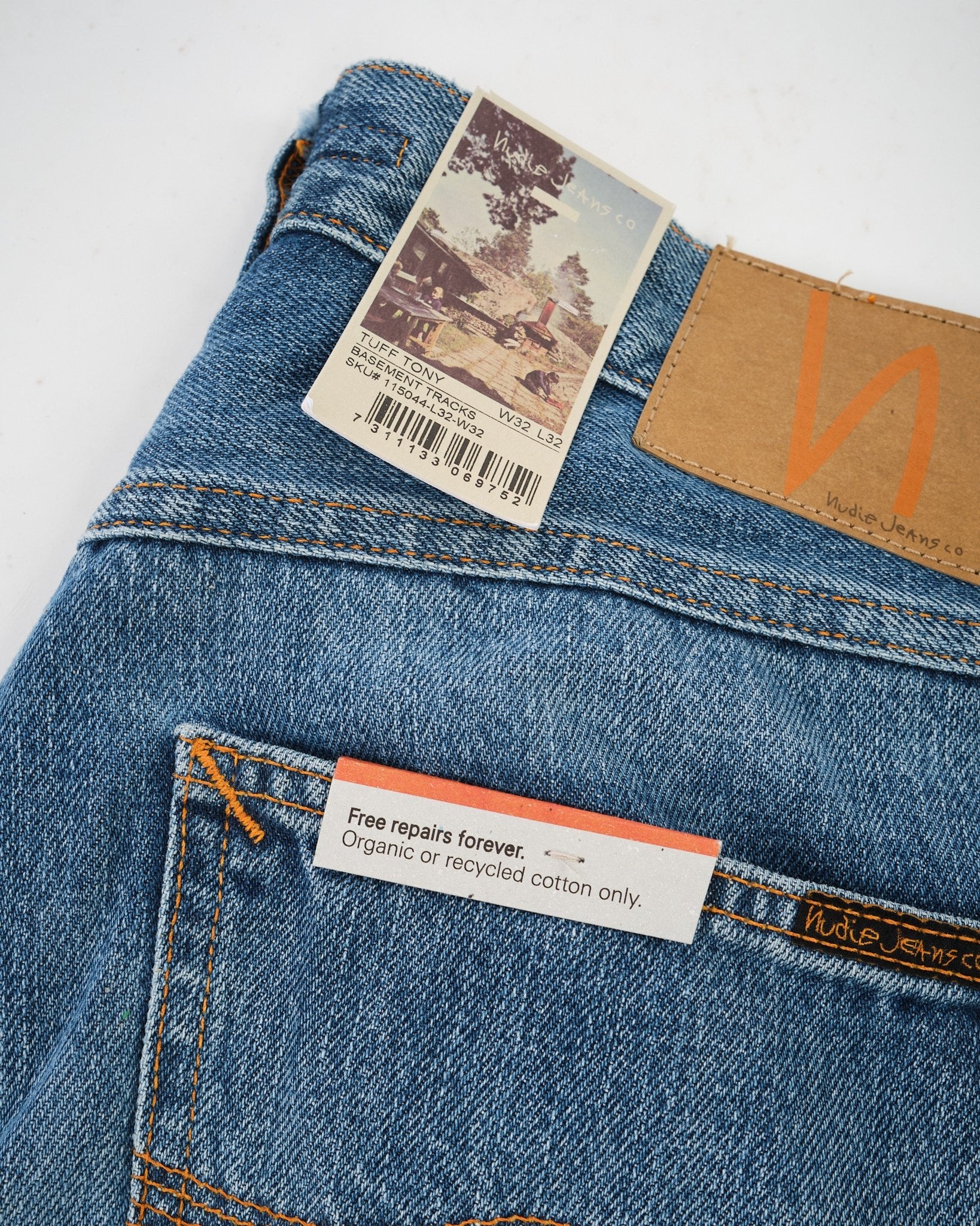 NUDIE JEANS CO. TUFF TONY BASEMENT TRACKS återskapar på ett autentiskt sätt slitage och slitmärken från ett par välanvända Nudie Jeans. Genom en avancerad reproduktionsteknik har alla naturliga slitningar och blekningseffekter från originaljeansen noggrant överförts till detta nya par.