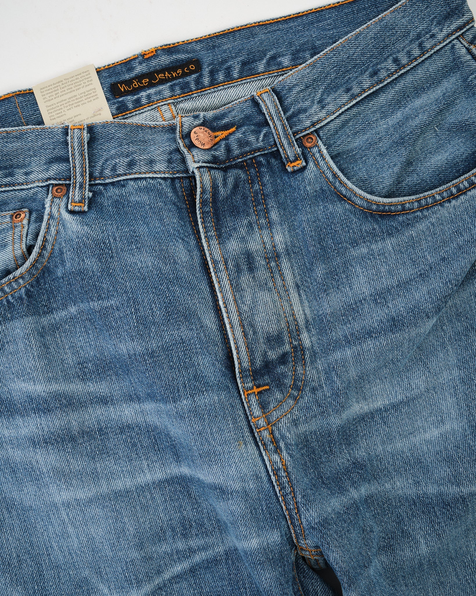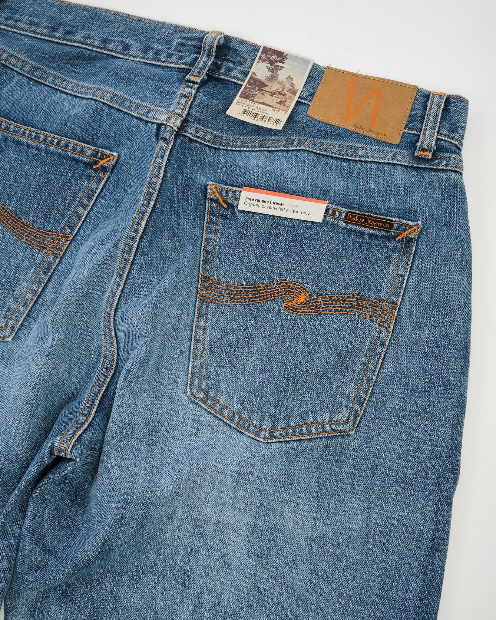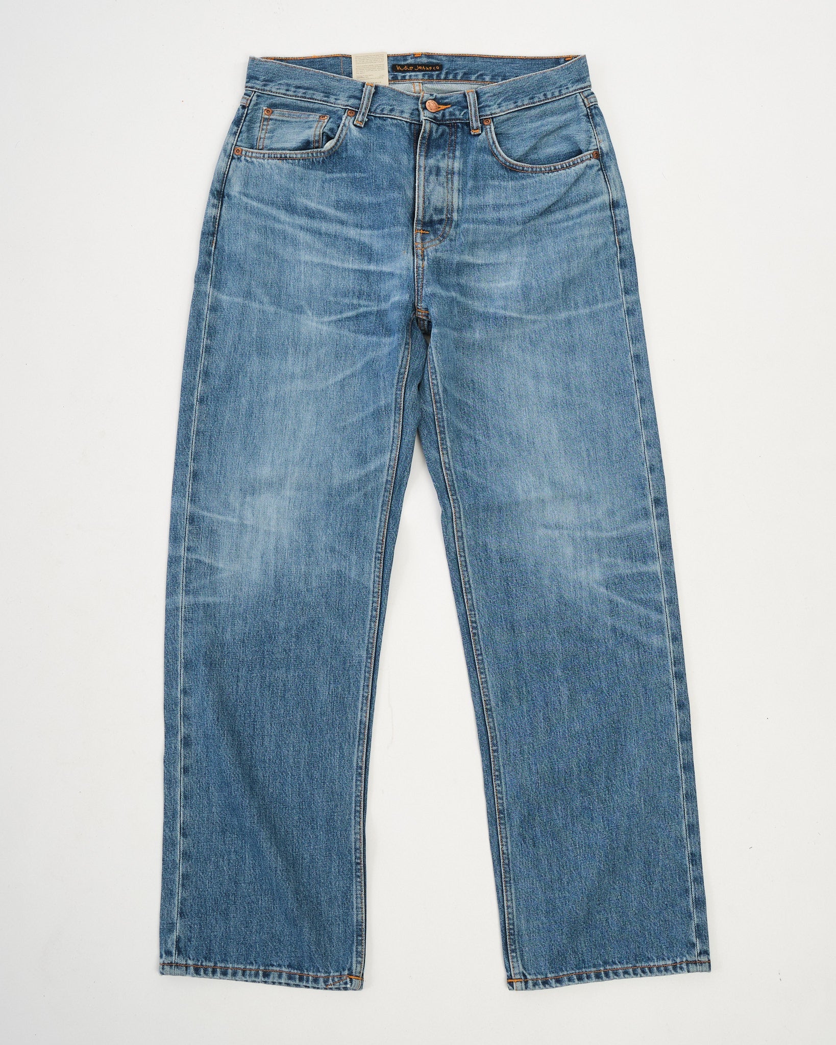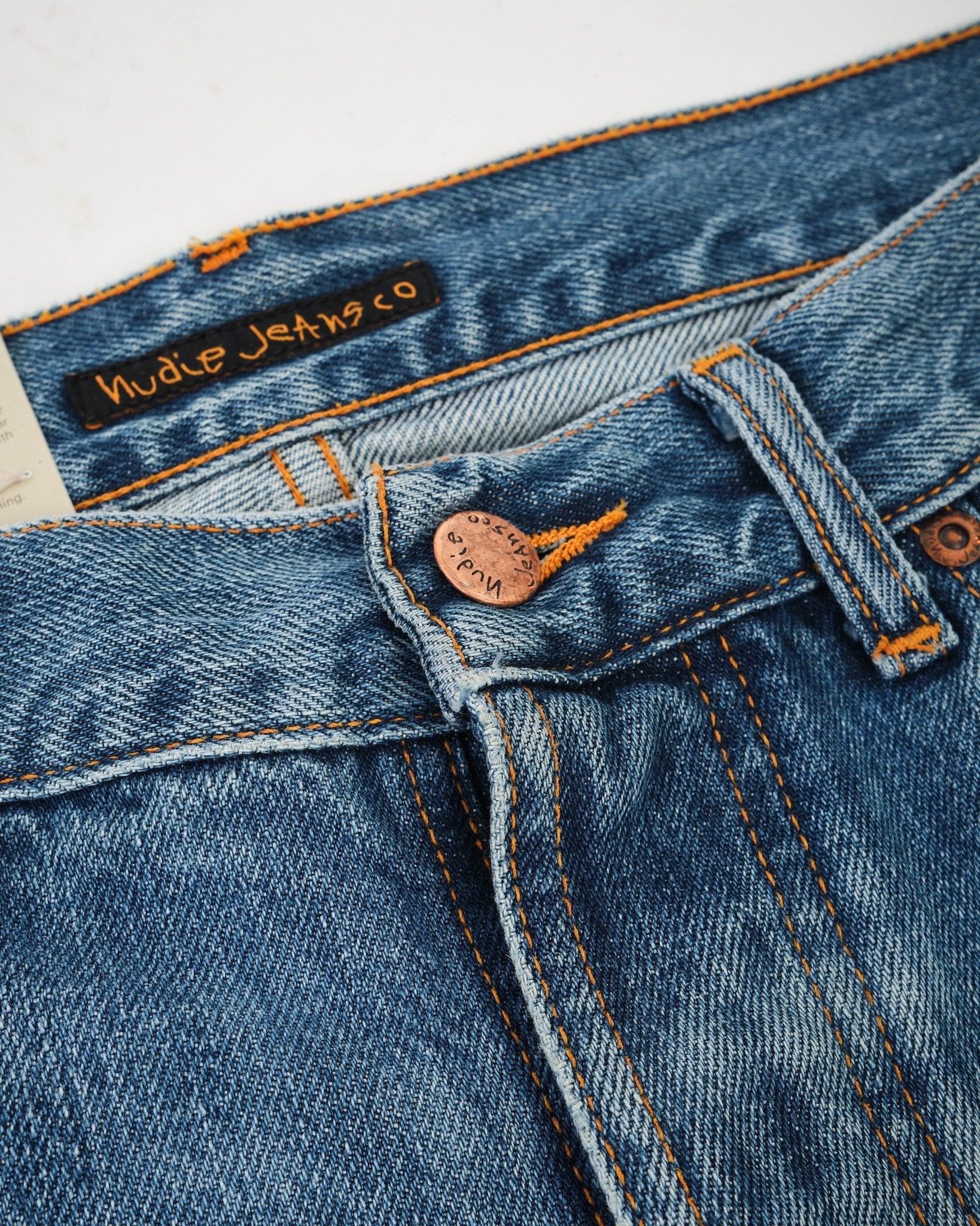 • Autentisk reproduktion av ett par slitna Nudie Jeans med realistisk blekning.