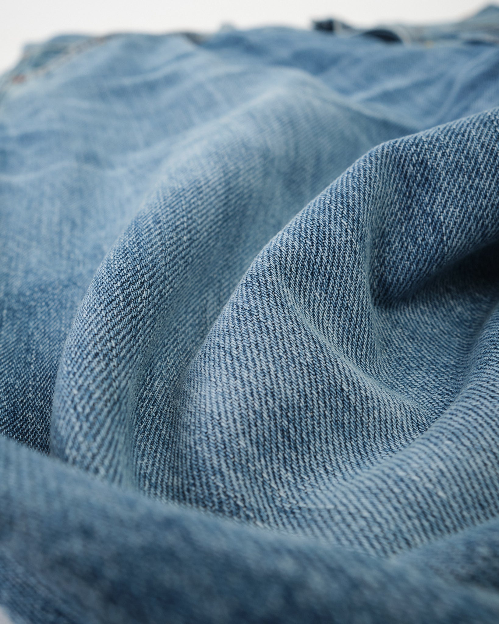 Tillverkade av premiumdenim, har dessa jeans en klarblå indigotvätt med nästan vita highlights och en subtil värme som förstärker det slitna utseendet. Den robusta texturen med tydliga vertikala slubs ger tyget extra djup, medan det marmorerade mönstret framhäver de mörkare partierna. De autentiskt återskapade slitningarna och blekningseffekterna ger en naturligt inarbetad look redan från första användningen.
