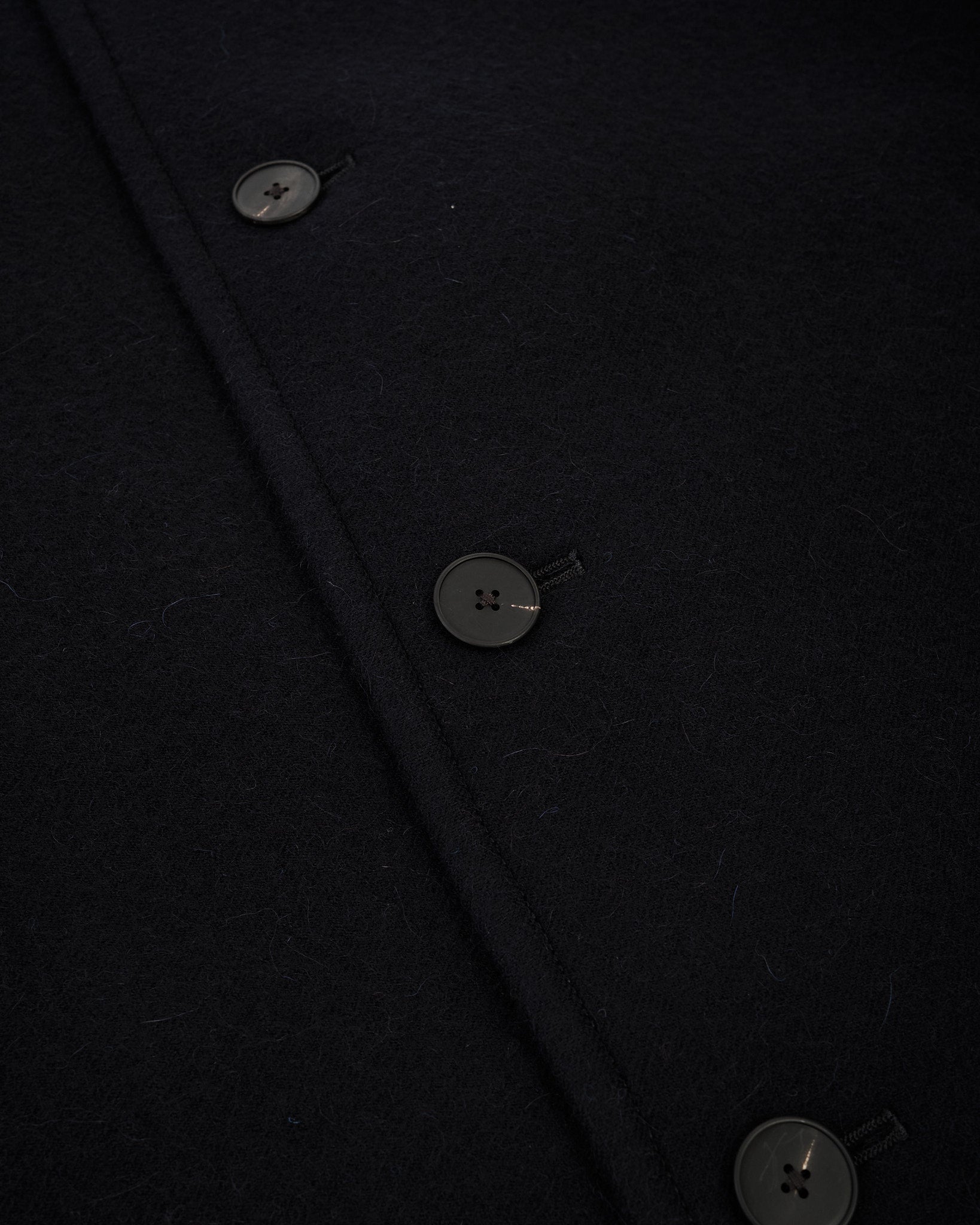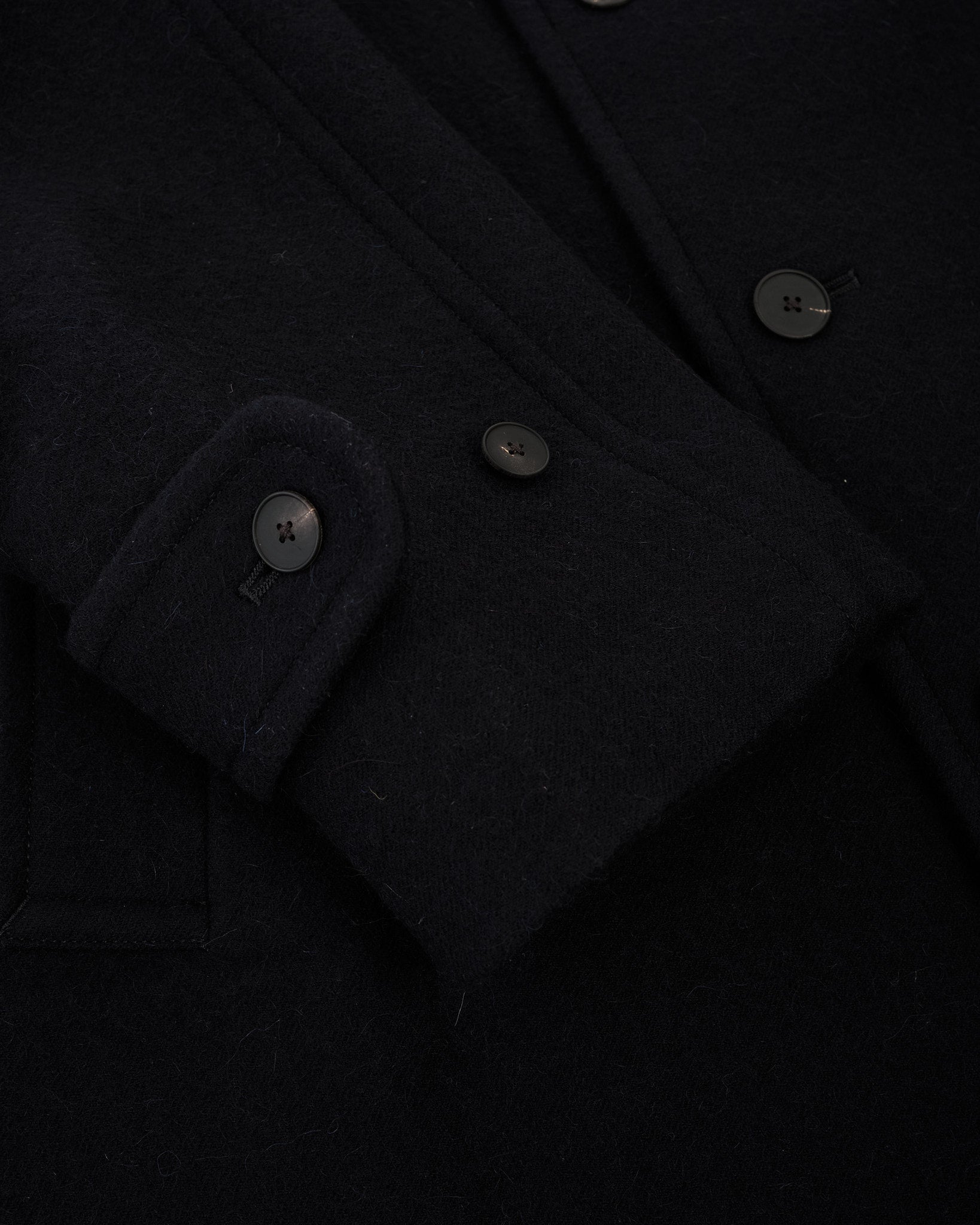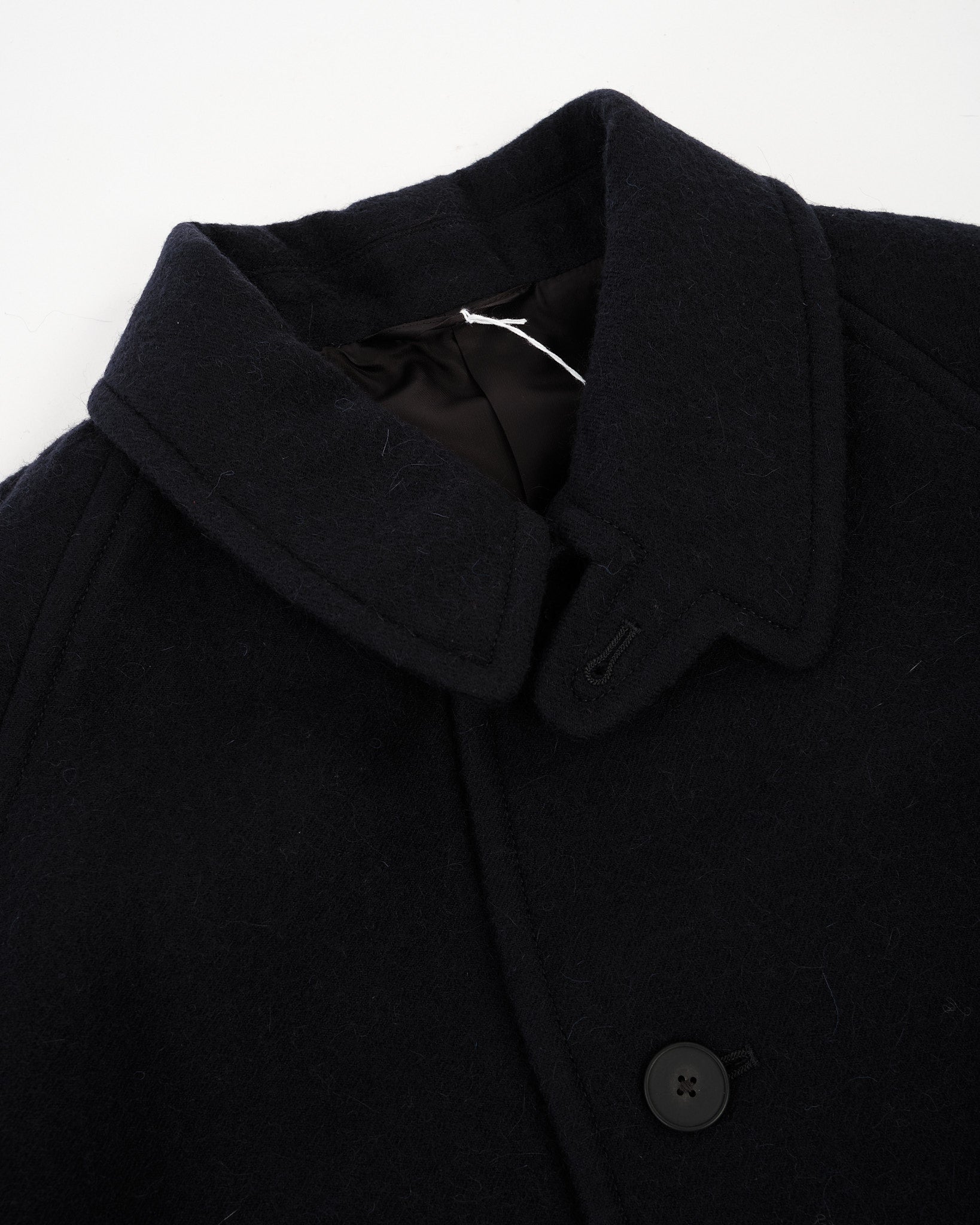 KAPTAIN SUNSHINE Umbrella Coat (KS25FCO04) i navy är en perfekt kombination av lyx och värme. Tillverkad av ett dubbelt tyg, vävt långsamt med hög densitet, blandar tyget varmt lama-alpaka och merinoull, vilket ger en exceptionellt mysig och sofistikerad känsla. Tyget är noggrant filtat för att skapa den perfekta balansen mellan volym och textur, vilket gör att kappan är både isolerande och elegant.