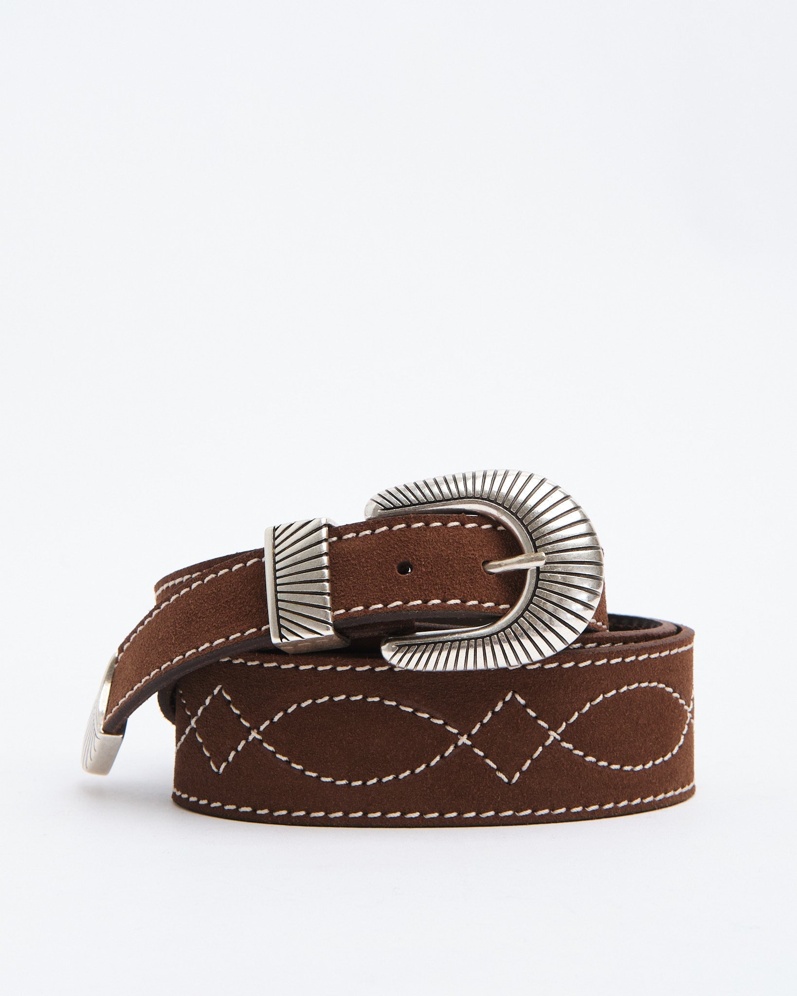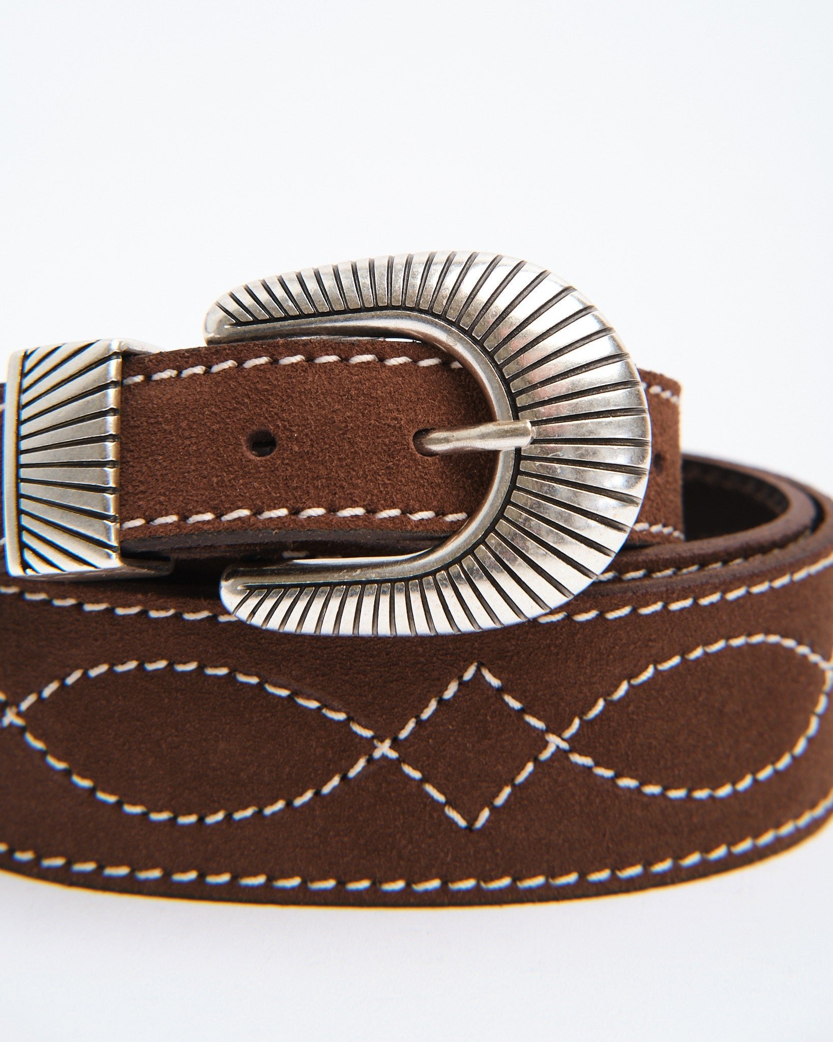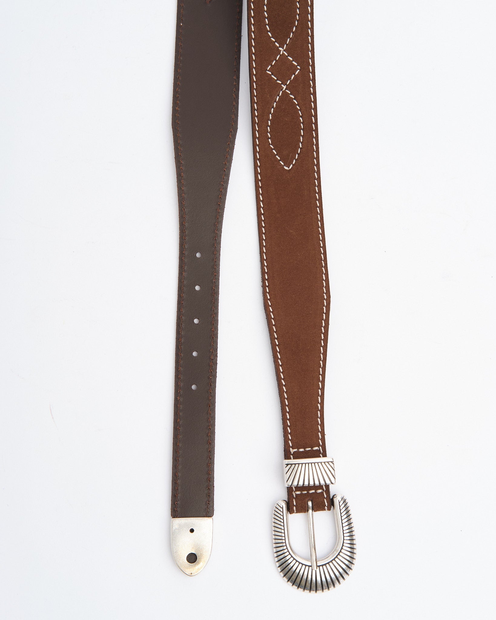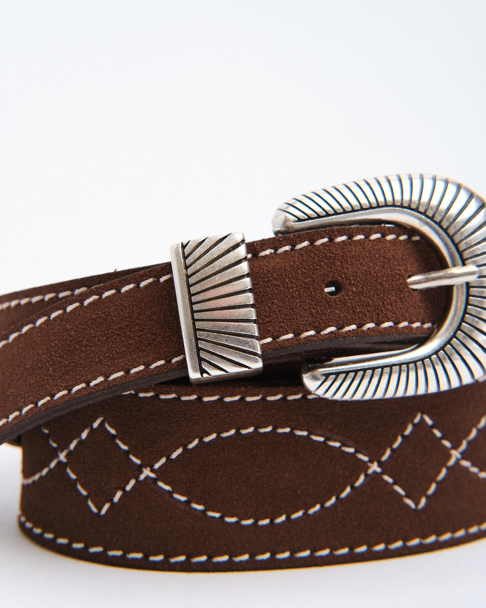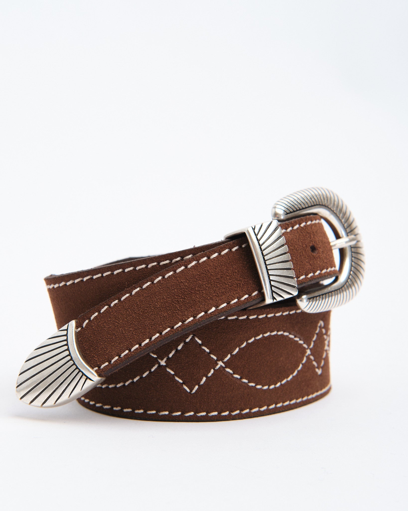 The Western Ranch Suede Belt in Toffee Brown brings a rugged yet refined touch to your everyday uniform. Crafted from vegetable-tanned suede and fully lined with full-grain leather, it’s built to break in beautifully over time. The Western-style profile narrows from 40 mm to 24 mm, making it versatile enough for denim or tailoring. Finished with a classic metal buckle and subtle detailing, it’s a piece made to hold everything together — in both function and form.