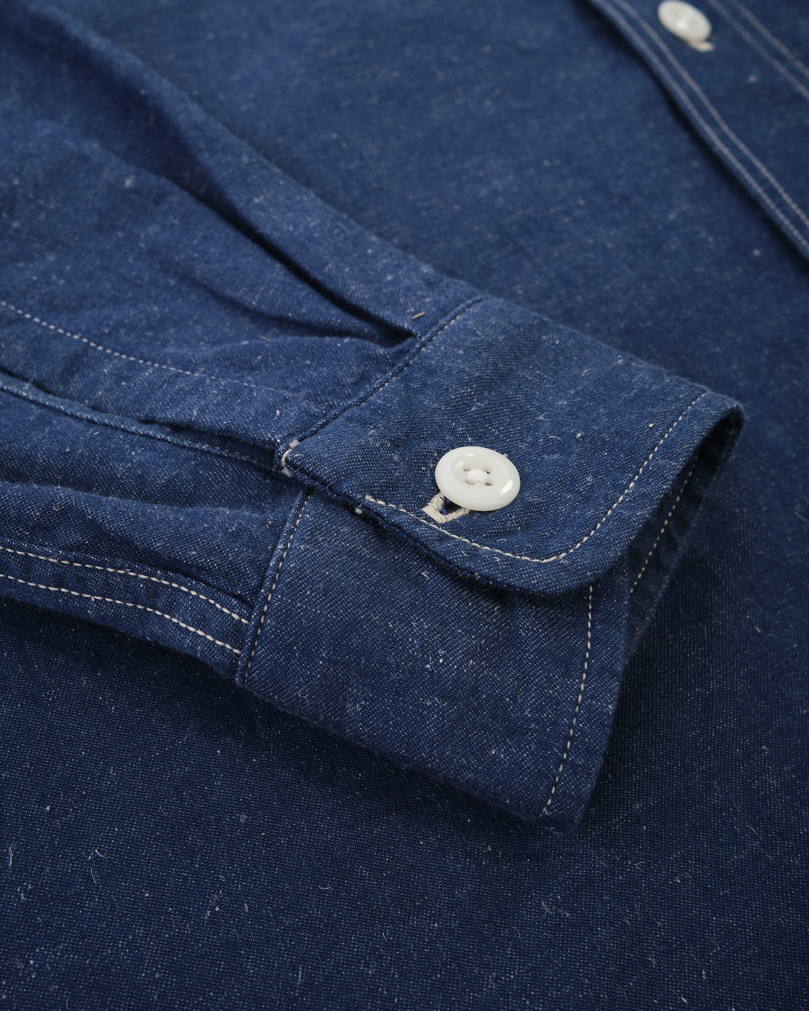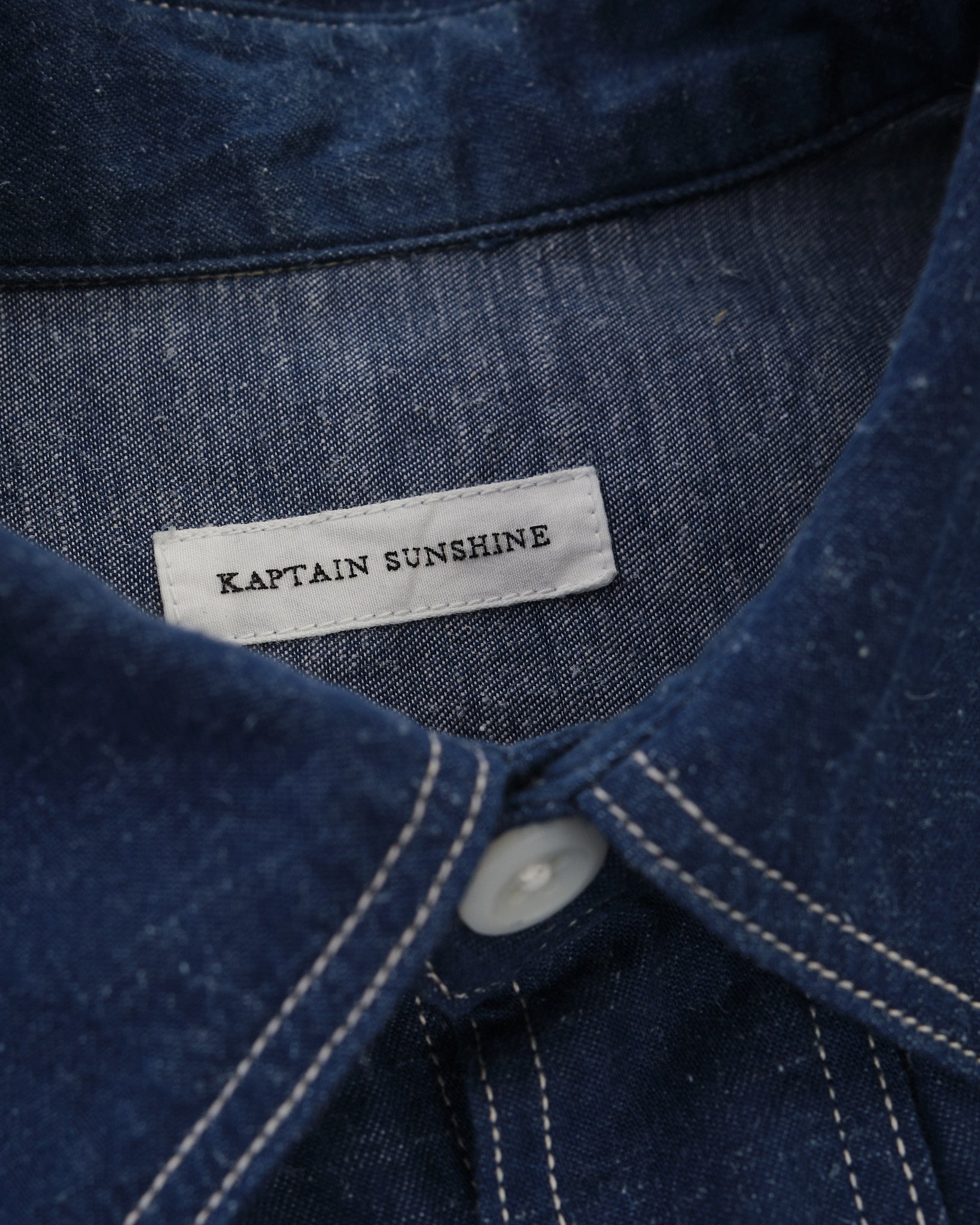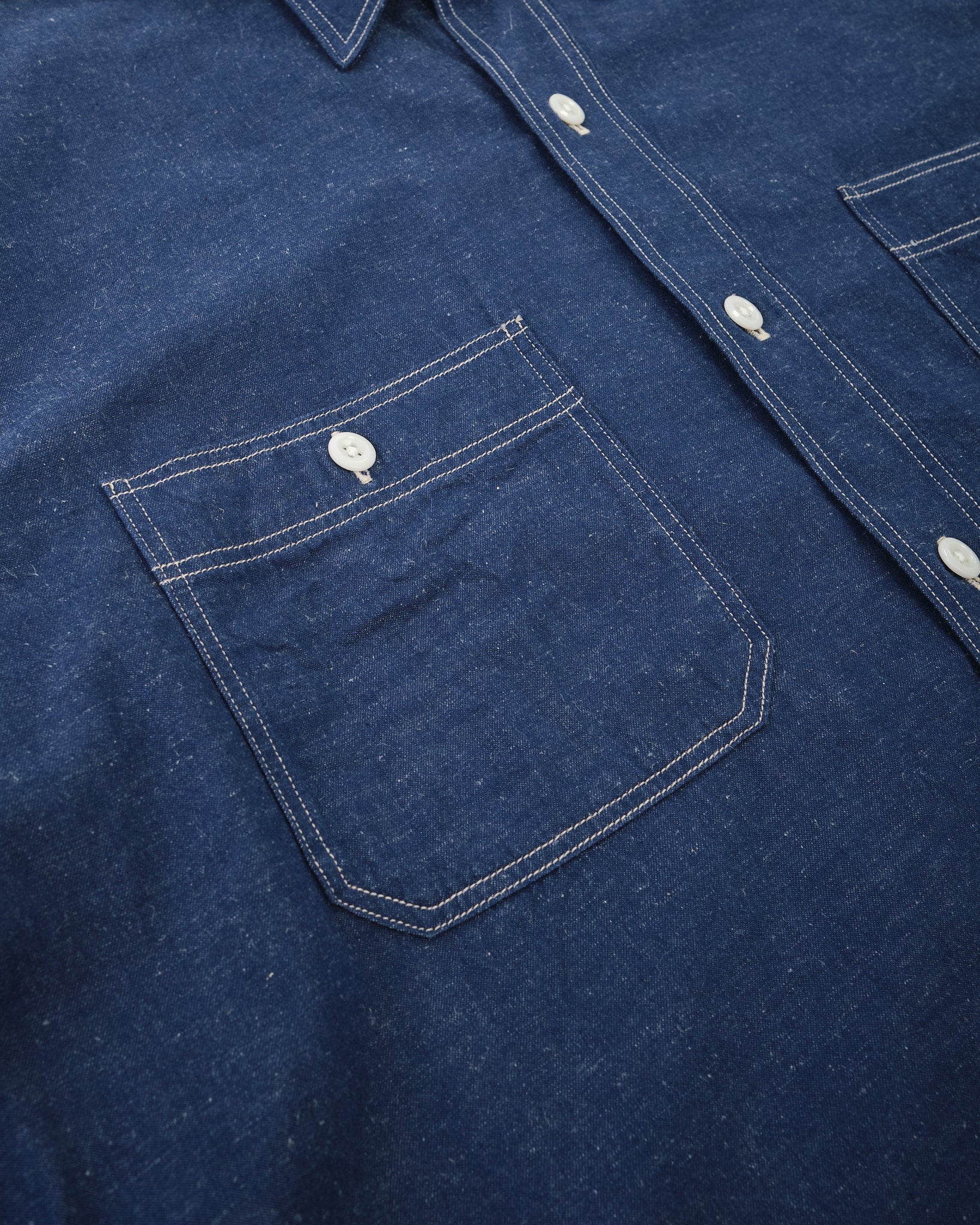 KAPTAIN SUNSHINE Work Shirt (KSBSSH03) i Indigo Blue är ett utmärkt exempel på högkvalitativ arbetskläder. Tillverkad av en blandning av extra-lång Suvin-bomull och hampa, är det ursprungliga garnet färgat med Indigo, vilket ger en rik, djup färg som åldras vackert över tid. Tyget är vävt med hög densitet på en gammal shuttlevävstol, vilket långsamt inkorporerar luft i väven för att öka texturen och hållbarheten. Resultatet är ett material som inte bara ser bra ut utan också utvecklas och blir mer unikt med tiden.
