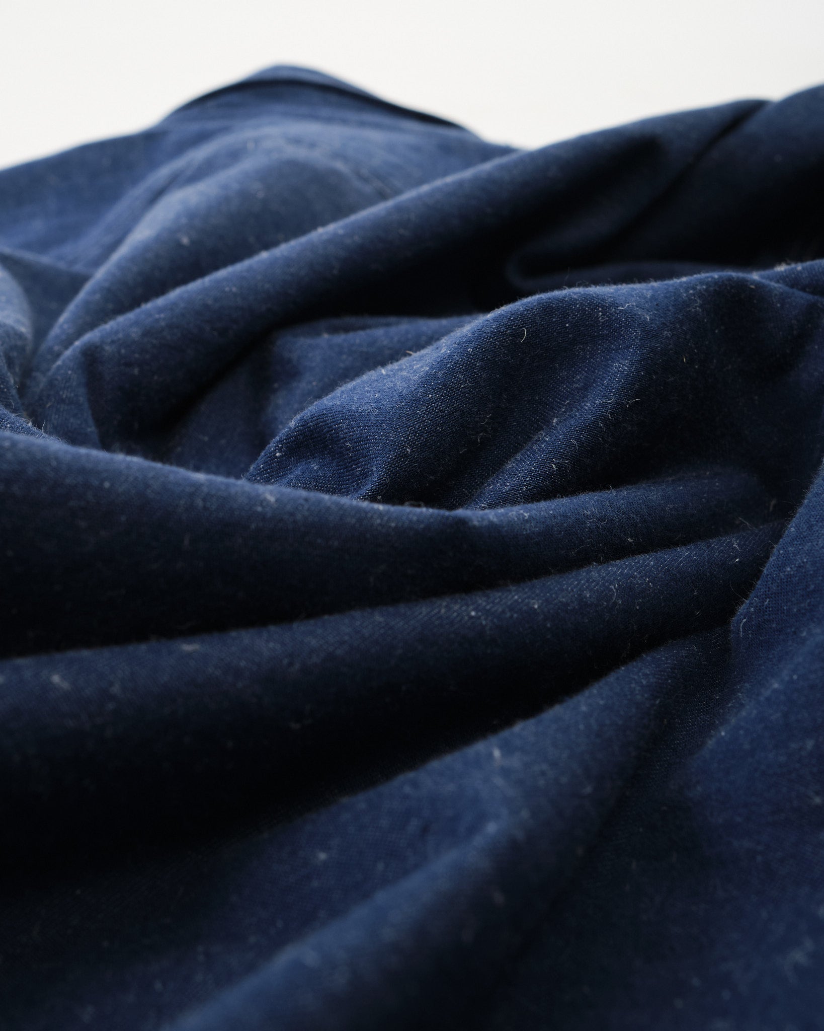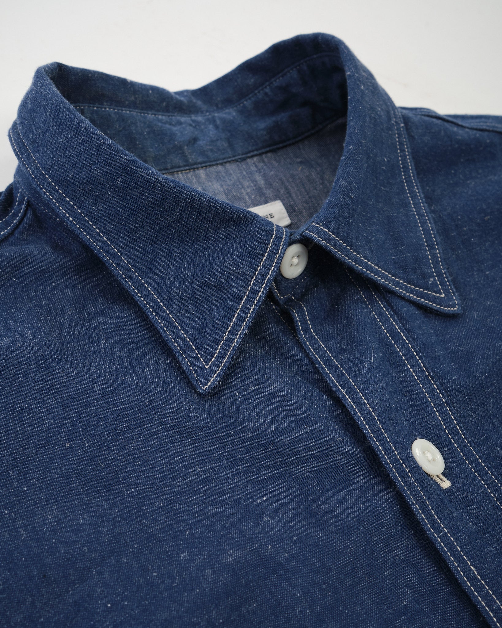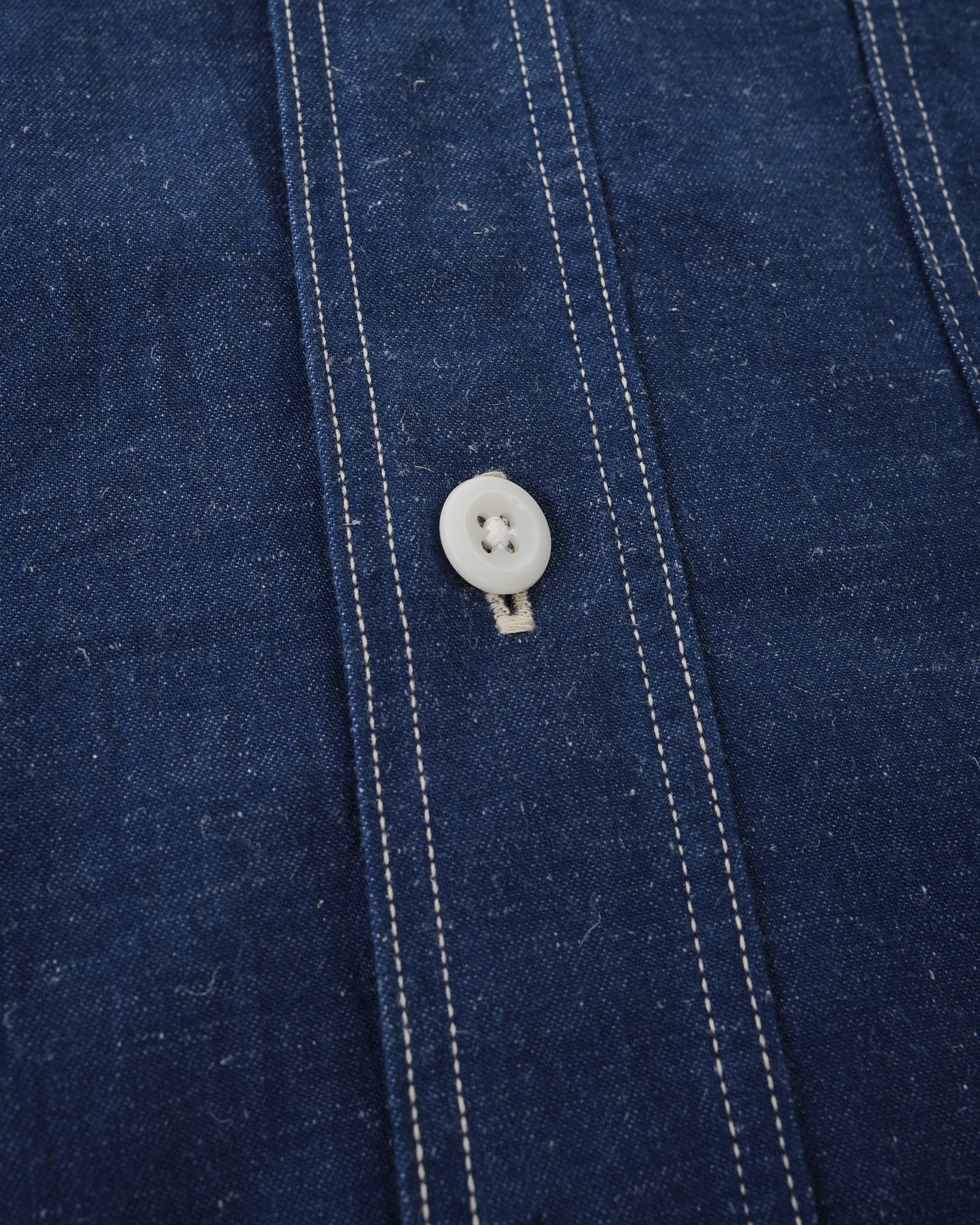 KAPTAIN SUNSHINE Work Shirt (KSBSSH03) i Indigo Blue är ett utmärkt exempel på högkvalitativ arbetskläder. Tillverkad av en blandning av extra-lång Suvin-bomull och hampa, är det ursprungliga garnet färgat med Indigo, vilket ger en rik, djup färg som åldras vackert över tid. Tyget är vävt med hög densitet på en gammal shuttlevävstol, vilket långsamt inkorporerar luft i väven för att öka texturen och hållbarheten. Resultatet är ett material som inte bara ser bra ut utan också utvecklas och blir mer unikt med tiden.